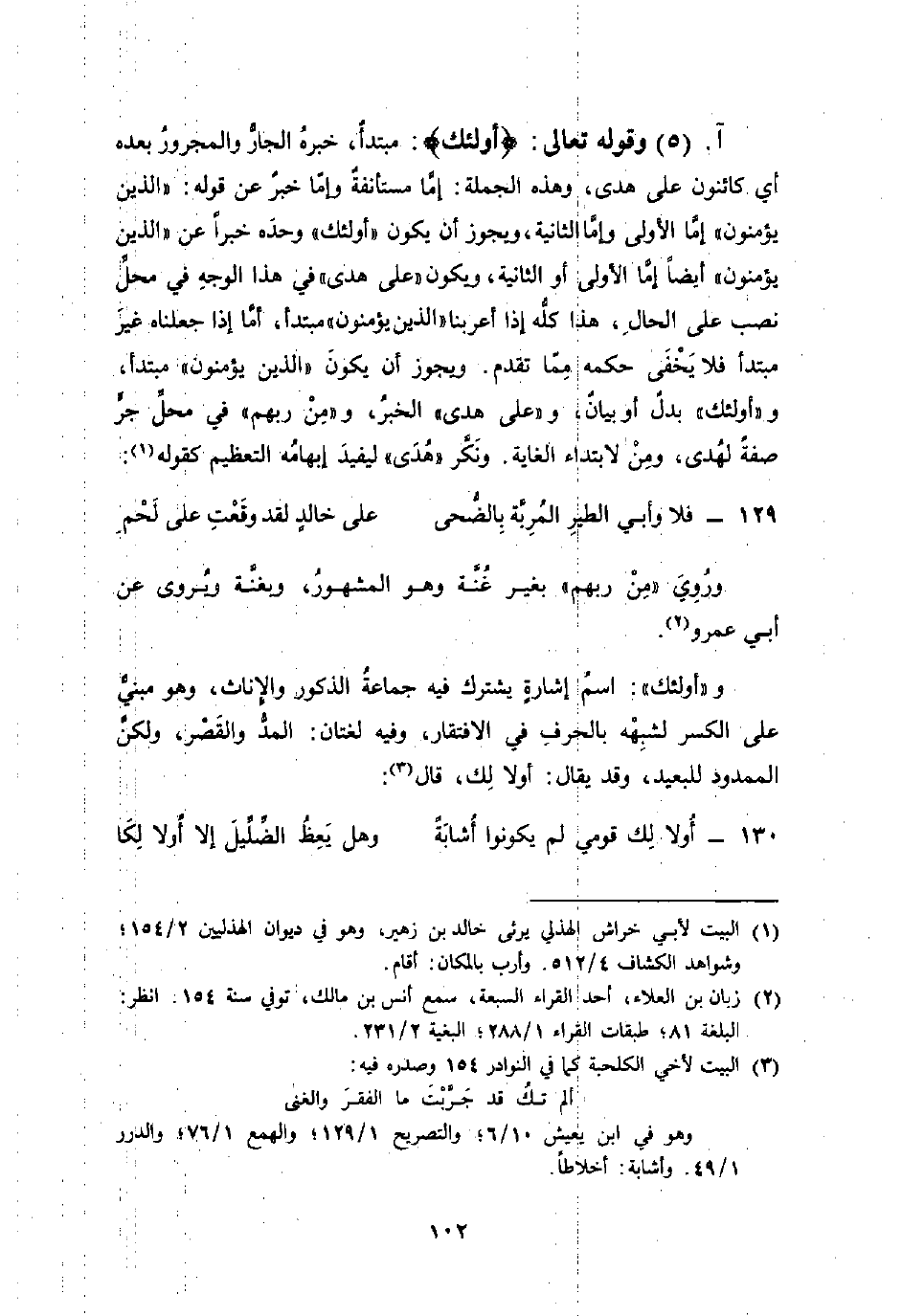 و «أولئك» : اسمُ إشارةٍ يشترك فيه جماعةُ الذكور والإِناث، وهو مبنيٌّ على الكسر لشبِهْه بالحرفِ في الافتقار، وفيه لغتان: المدُّ والقَصْر، ولكنَّ الممدود للبعيد، وقد يقال: أولا لِك، قال: