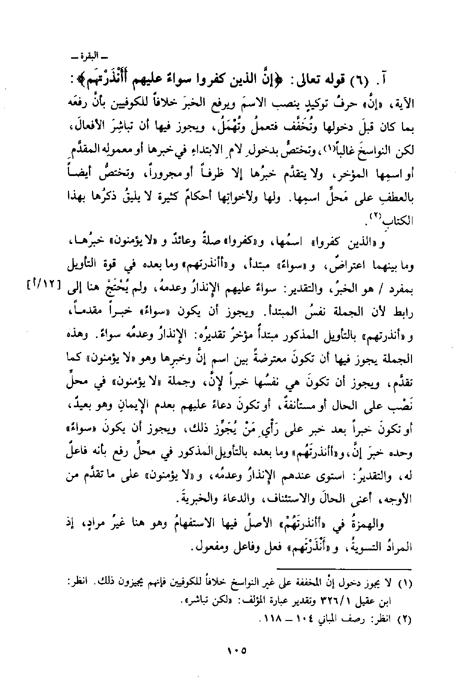 قوله تعالى: {إِنَّ الذين كَفَرُواْ سَوَآءٌ عَلَيْهِمْ أَأَنذَرْتَهُمْ} : الآية، «إنَّ» حرفُ توكيدٍ ينصب الاسمَ ويرفع الخبرَ خلافاً للكوفيين بأنَّ رفعَه بما كان قبلَ دخولها وتُخَفَّف فتعملُ وتُهْمَلُ، ويجوز فيها أن تباشِرَ الأفعالَ، لكن النواسخَ غالباً، وتختصُّ بدخولِ لامِ الابتداءِ في خبرها أو معمولِه المقدَّمِ أو اسمِها المؤخر، ولا يتقدَّم خبرُها إلا ظرفاً أو مجروراً، وتختصُّ أيضاً بالعطفِ على مَحلِّ اسمِها. ولها ولأخواتِها أحكامٌ كثيرة لا يليقُ ذكرُها بهذا الكتابِ.