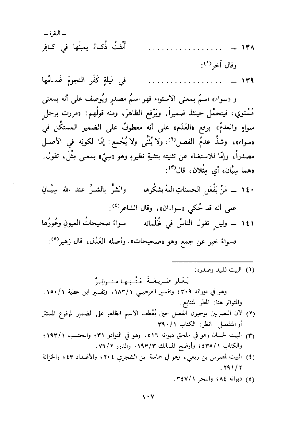 و «سواء» اسمٌ بمعنى الاستواء فهو اسمُ مصدرٍ ويُوصف على أنه بمعنى مُسْتوي، فيتحمَّل حينئذ ضميراً، ويَرْفع الظاهرَ، ومنه قولُهم: مررت برجلٍ سواءٍ والعدمُ «برفع» العَدَم «على أنه معطوفٌ على الضمير المستكِّن في» سواء «، وشذَّ عدمُ الفصل، ولا يُثَنَّى ولا يُجْمع: إمَّا لكونِه في الأصل مصدراً، وإمَّا للاستغناء عن تثنيته بتثنيةِ نظيرهِ وهو» سِيّ «بمعنى مِثْلَ، تقول:» هما سِيَّان «أي مِثْلان، قال: