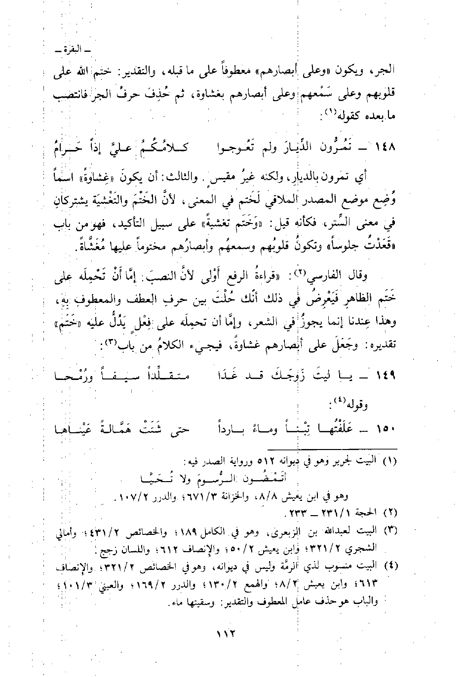 أي تمرون بالديارِ، ولكنه غيرُ مقيسٍ. والثالث: أن يكونَ «غِشاوةً» اسماً وُضِع موضع المصدر الملاقي لَخَتم في المعنى، لأنَّ الخَتْمَ والتَغْشيَة يشتركانِ في معنى السَِّتر، فكأنه قيل: «وخَتَم تغشيةً» على سبيل التأكيد، فهو من باب «قَعَدْتُ جلوساً» وتكونُ قلوبُهم وسمعهُم وأبصارُهم مختوماً عليها مُغَشَّاةً.