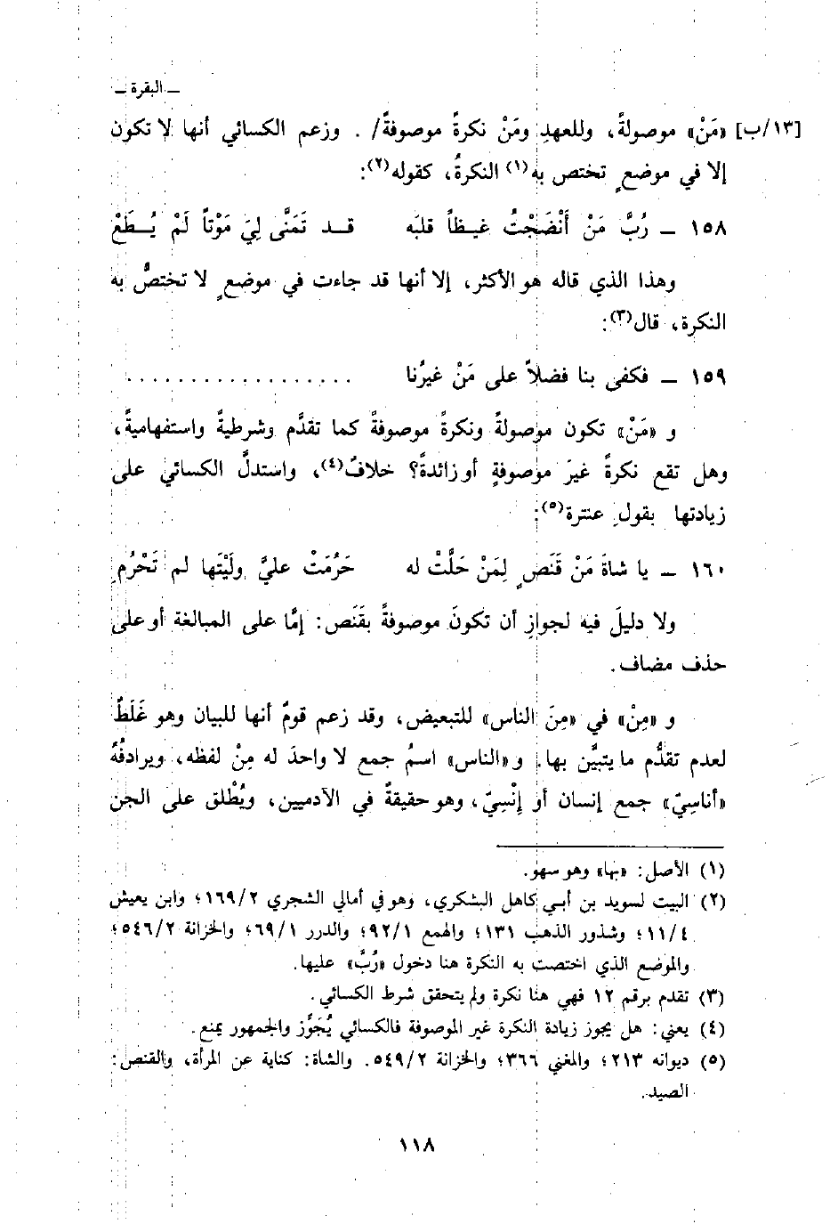 مَنْ «موصولةً، وللعهدِ ومَنْ نكرةً موصوفةً/. وزعم الكسائي أنها لا تكون إلا في موضعٍ تختص به النكرةُ، كقوله: