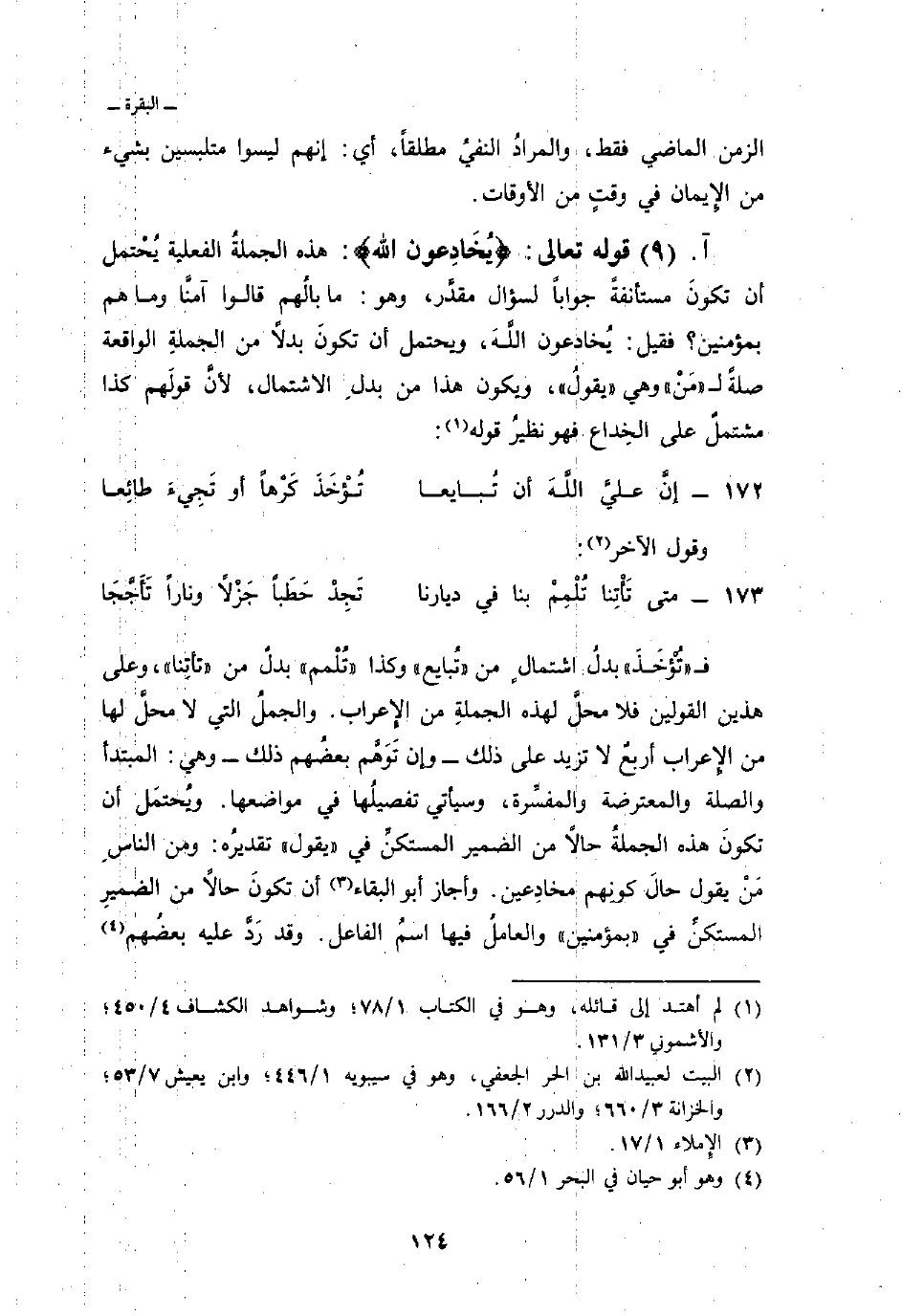 ف «تُؤْخَذَ» بدلُ اشتمالٍ من «تُبايع» وكذا «تُلْمم» بدلٌ من «تأتِنا» ، وعلى هذين القولين فلا محلَّ لهذه الجملةِ من الإِعراب. والجملُ التي لا محلَّ لها من الإِعراب أربعٌ لا تزيد على ذلك -وإن تَوَهَّم بعضُهم ذلك- وهي: المبتدأ والصلة والمعترضة والمفسِّرة، وسيأتي تفصيلُها في مواضعها. ويُحْتمَل أن تكونَ هذه الجملةُ حالاً من الضمير المستكنِّ في «يقول» تقديرُه: ومن الناسِ مَنْ يقول حالَ كونِهم مخادِعين. وأجاز أبو البقاء أن تكونَ حالاً من الضميرِ المستكنِّ في «بمؤمنين» والعاملُ فيها اسمُ الفاعل. وقد رَدَّ عليه بعضُهم