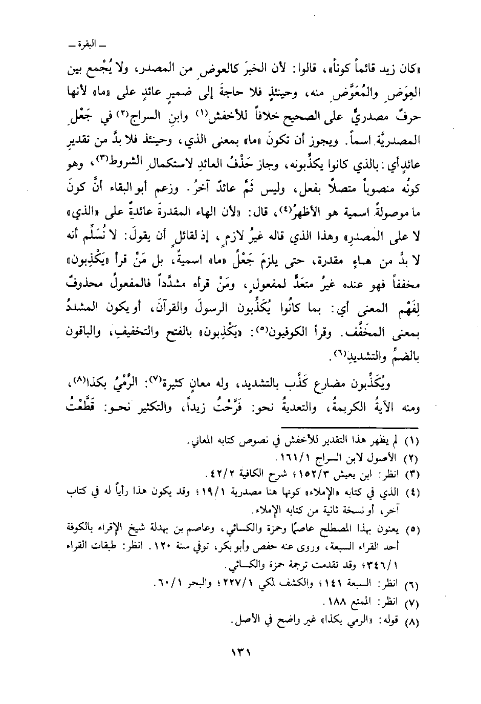 وزعم أبو البقاء أنَّ كونَ ما موصولةً اسمية هو الأظهرُ، قال: «لأن الهاء المقدرةَ عائدةٌ على» الذي «لا على المصدرِ» وهذا الذي قاله غيرُ لازمٍ، إذ لقائلٍ أن يقولَ: لا نُسَلِّم أنه لا بدَّ من هاءٍ مقدرة، حتى يلزمَ جَعْلُ «ما» اسميةً، بل مَنْ قرأ «يَكْذِبون» مخففاً فهو عنده غيرُ متعَدٍّ لمفعولٍ، ومَنْ قرأه مشدَّداً فالمفعولُ محذوفٌ لِفَهْم المعنى أي: بما كانُوا يُكَذِّبون الرسولَ والقرآنَ، أو يكون المشددُ بمعنى المخَفَّف. وقرأ الكوفيون: «يَكْذِبون» بالفتح والتخفيفِ، والباقون بالضمِّ والتشديدِ.
