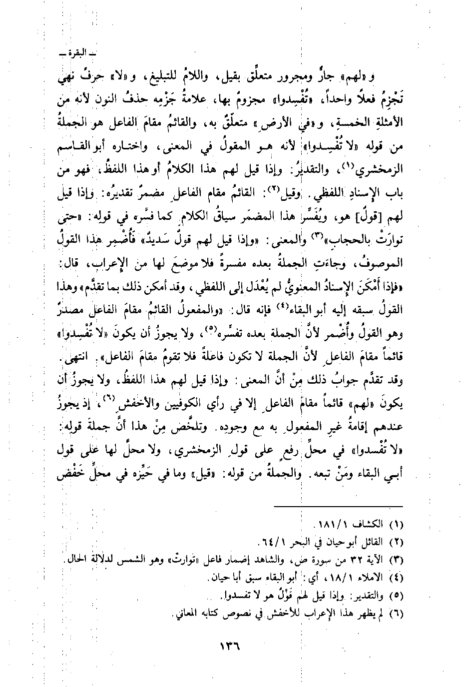 و «لهم» جارٌّ ومجرور متعلِّق بقيل، واللامُ للتبليغ، و «لا» حرفُ نهي تَجْزِمُ فعلاً واحداً، «تُفْسِدوا» مجزومٌ بها، علامةُ جَزْمِه حذفُ النون لأنه من الأمثلةِ الخمسةِ، و «في الأرضِ» متعلّقٌ به، والقائمُ مقامَ الفاعل هو الجملةُ من قوله «لا تُفْسِدوا» لأنه هو المقولُ في المعنى، واختاره أبو القاسم الزمخشري، والتقديرُ: وإذا قيل لهم هذا الكلامُ أو هذا اللفظُ، فهو من باب الإِسنادِ اللفظي. وقيل: القائمُ مقام الفاعلِ مضمرٌ تقديرُه: وإذا قيل لهم [قولٌ] هو، ويُفَسِّر هذا المضمَر سياقُ الكلامِ كما فسَّره في قولِه: {حتى تَوَارَتْ بالحجاب} [ص: 32] والمعنى: «وإذا قيل لهم قولٌ سَديدٌ» فَأُضْمِر هذا القولُ الموصوفُ، وجاءَتِ الجملةُ بعده مفسرةً فلا موضعَ لها من الإِعراب، قال: «فإذا أَمْكَنَ الإِسنادُ المعنويُّ لم يُعْدَل إلى اللفظي، وقد أمكن ذلك بما تقدَّم» وهذا القولُ سبقه إليه أبو البقاء فإنه قال: «والمفعولُ القائمُ مقامَ الفاعل مصدرٌ وهو القولُ وأُضْمر لأنَّ الجملة بعد تفسِّره، ولا يجوزُ أن يكونَ» لا تُفْسِدوا «قائماً مقامَ الفاعلِ لأنَّ الجملة لا تكون فاعلةً فلا تقومُ مقامَ الفاعل» . انتهى. وقد تقدَّم جوابُ ذلك مِنْ أنَّ المعنى: وإذا قيل لهم هذا اللفظُ، ولا يجوزُ أن يكونَ «لهم» قائماً مقامَ الفاعلِ إلا في رأي الكوفيين والأخفشِ، إذ يجوزُ عندهم إقامةُ غيرِ المفعولِ به مع وجودِه. وتلخَّص مِنْ هذا أنَّ جملةَ قولِه: «لا تُفْسدوا» في محلِّ رفعٍ على قولِ الزمخشري، ولا محلَّ لها على قول أبي البقاء ومَنْ تبعه. والجملةُ من قوله: «قيل» وما في حيِّزِه في محلِّ خَفْض