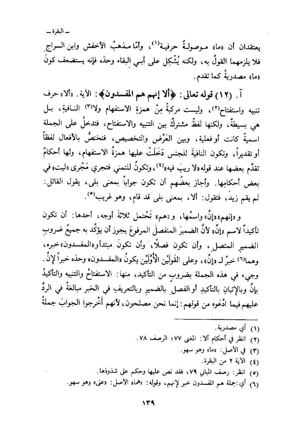 و «إنهم» «إنَّ» واسمُها، و «هم» تَحْتمل ثلاثةَ أوجه، أحدها: أن تكون تأكيداً لاسم «إنَّ» لأنَّ الضميرَ المنفصلَ المرفوعَ يجوز أن يؤكَّد به جميعُ ضروبِ الضميرِ المتصلِ، وأن تكون فصلاً، وأن تكونَ مبتدأ و «المفسدون» خبره، وهما خيرٌ ل «إنَّ» ، وعلى القَولَيْن الأَوَّلَيْن يكونُ «المفسدون» وحده خبراً لإِنَّ. وجيء في هذه الجملة بضروبٍ من التأكيد، منها: الاستفتاحُ والتنبيه والتأكيدُ بإنَّ وبالإِتيانِ وبالتأكيدِ أو الفصلِ بالضميرِ وبالتعريفِ في الخبر مبالغةً في الردِّ عليهم فيما ادَّعَوه من قولهم: إنما نحن مصلحون، لأنهم أَخْرجوا الجوابَ جملةً