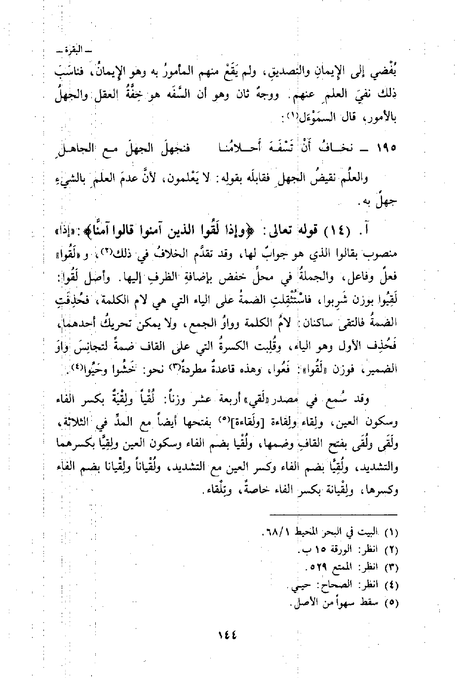 قوله تعالى: {وَإِذَا لَقُواْ الذين آمَنُواْ قالوا آمَنَّا} : «إذا» منصوب بقالوا الذي هو جوابٌ لها، وقد تقدَّم الخلافُ في ذلك، و «لَقُوا» فعلٌ وفاعل، والجملةُ في محلِّ خفض بإضافةِ الظرفِ إليها. وأصل لَقُوا: لَقِيُوا بوزن شَرِبوا، فاسْتُثْقِلتِ الضمةُ على الياء التي هي لام الكلمة، فحُذِفَتِ الضمةُ فالتقى ساكنان: لامُ الكلمة وواوُ الجمع، ولا يمكن تحريكُ أحدهما، فَحُذِف الأول وهو الياء، وقُلِبت الكسرةُ التي على القاف ضمةً لتجانِسَ واوَ الضمير، فوزن «لَقُوا» : فَعُوا، وهذه قاعدةٌ مطردةٌ نحو: خَشُوا وحَيُوا.