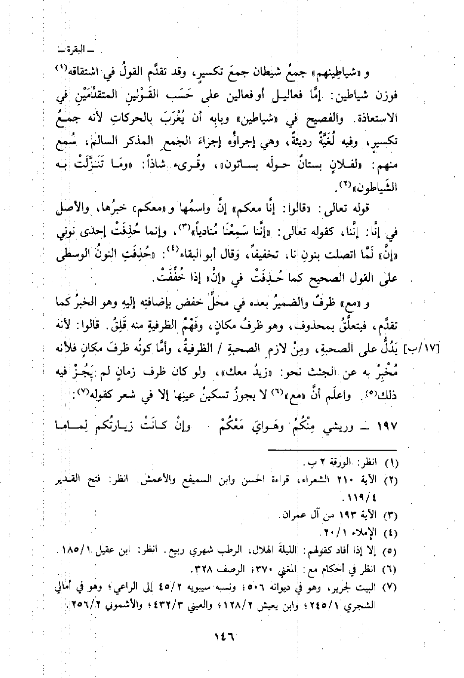 و «شياطينهم» جمعُ شيطان جمعَ تكسيرٍ، وقد تقدَّم القولُ في اشتقاقه فوزن شياطين: إمَّا فعاليل أو فعالين على حَسَب القَوْلينِ المتقدِّمَيْنِ في الاستعاذة. والفصيح في «شياطين» وبابِه أن يُعْرَبَ بالحركاتِ لأنه جمعُ تكسيرٍ، وفيه لُغَيَّةٌ رديئةٌ، وهي إجراؤُه إجراءَ الجمعِ المذكر السالم، سُمع منهم: «لفلانٍ بستانٌ حولَه بساتون» ، وقُرئ شاذاً: {وَمَا تَنَزَّلَتْ بِهِ الشياطون} [الشعراء: 210] .