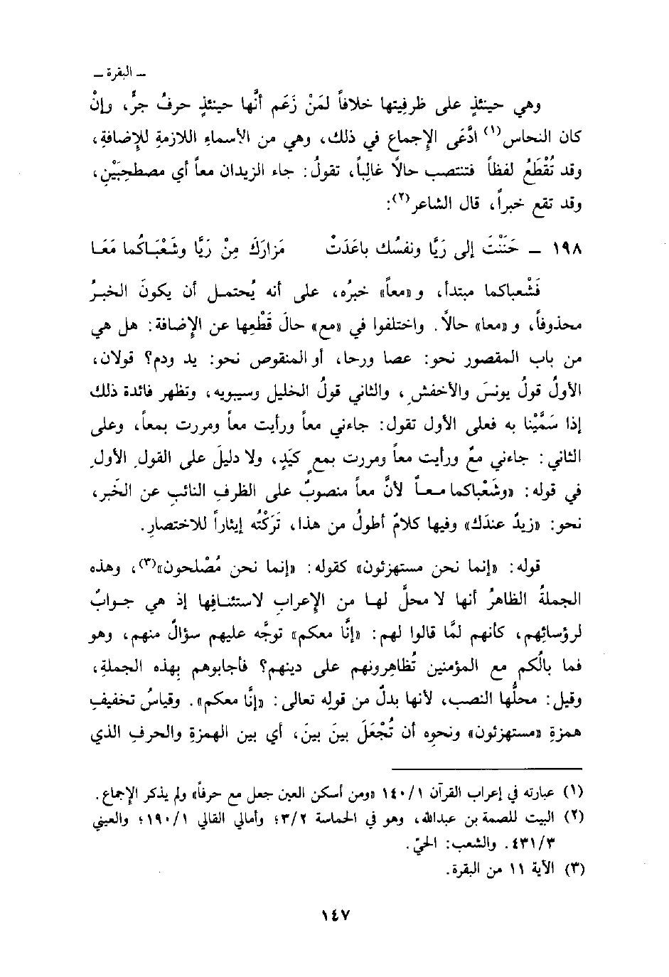 فَشْعباكما مبتدأ، و» معاً «خبرُه، على أنه يُحتمل أن يكونَ الخبرُ محذوفاً، و» معا «حالاً. واختلفوا في» مع «حالَ قَطْعِها عن الإِضافة: هل هي من باب المقصور نحو: عصا ورحا، أو المنقوص نحو: يد ودم؟ قولان، الأولُ قولُ يونسَ والأخفشِ، والثاني قولُ الخليل وسيبويه، وتظهر فائدة ذلك إذا سَمَّيْنا به فعلى الأول تقول: جاءني معاً ورأيت معاً ومررت بمعاً، وعلى الثاني: جاءني معٌ ورأيت معاً ومررت بمعٍ كيَدٍ، ولا دليلَ على القولِ الأولِ في قوله:» وشَعْباكما معاً لأنَّ معاً منصوبٌ على الظرفِ النائبِ عن الخَبر، نحو: «زيدٌ عندَك» وفيها كلامٌ أطولُ من هذا، تَرَكْتُه إيثاراً للاختصارِ.