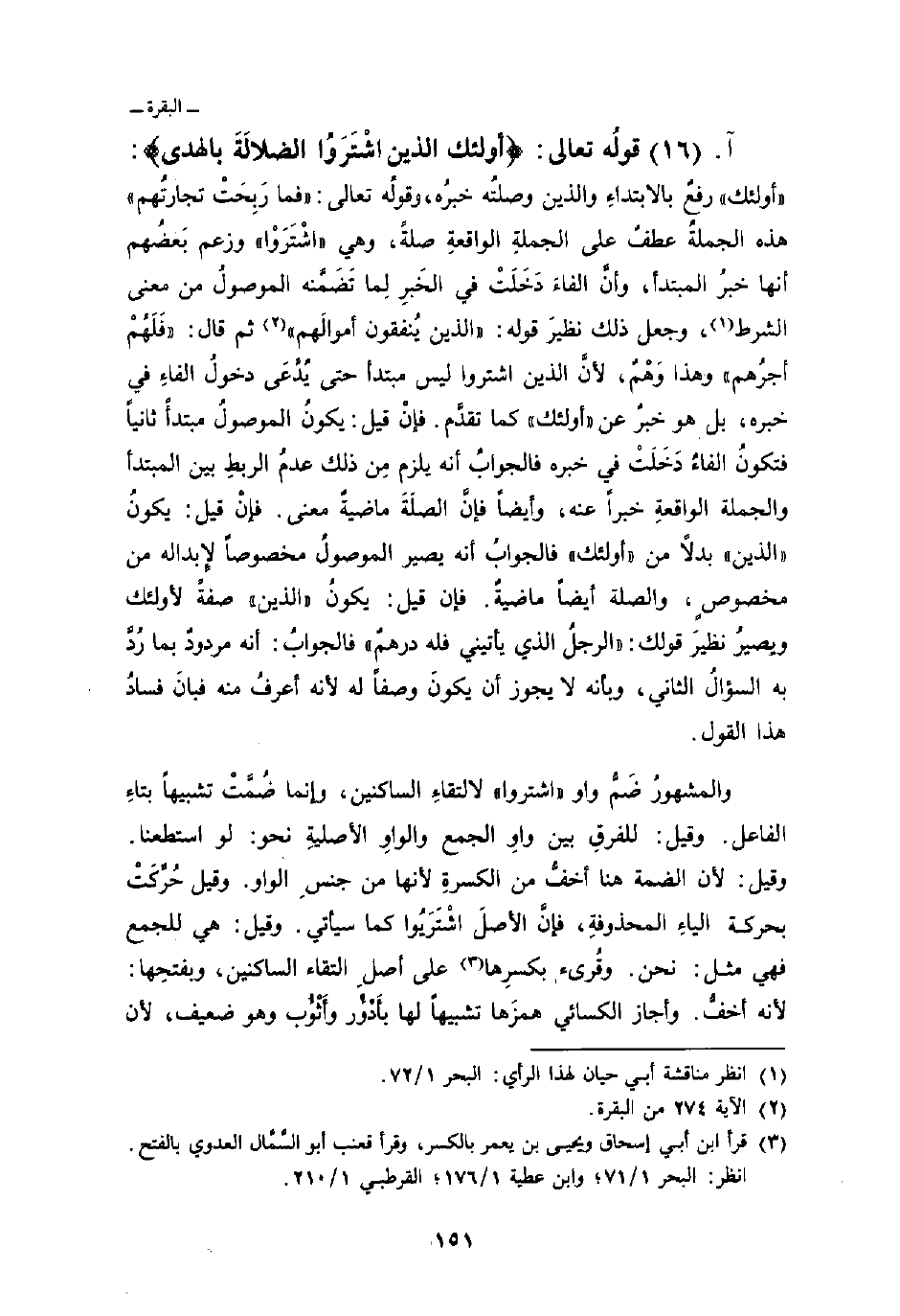 والمشهورُ ضَمُّ واو «اشتروا» لالتقاءِ الساكنين، وإنما ضُمَّتْ تشبيهاً بتاءِ الفاعل. وقيل: للفرقِ بين واوِ الجمع والواوِ الأصليةِ نحو: لو استطعنا. وقيل: لأن الضمة هنا أخفُّ من الكسرةِ لأنها من جنسِ الواو. وقيل حُرِّكَتْ بحركة الياءِ المحذوفةِ، فإنَّ الأصلَ اشْتَرَيُوا كما سيأتي. وقيل هي للجمع فهي مثل: نحن. وقُرئ بكسرِها على أصلِ التقاء الساكنين، وبفتحِها: لأنه أخفُّ. وأجاز الكسائي همزَها تشبيهاً لها بأَدْؤُر وأَثْؤُب وهو ضعيف، لأن