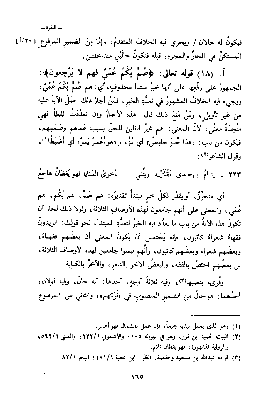 الجمهورُ على رَفْعِها على أنها خبرُ مبتدأ محذوفٍ، أي: هم صُمٌّ بُكْمٌ عُمْيٌ، ويَجيء فيه الخلافُ المشهورُ في تعدُّدِ الخبرِ، فَمَنْ أجازَ ذلك حَمَلَ الآيةَ عليه من غير تأويلٍ، ومَنْ مَنَعَ ذلك قال: هذه الأخبارُ وإن تعدَّدَتْ لفظاً فهي متَّحِدَةٌ معنًى، لأنَّ المعنى: هم غيرُ قائلين للحقِّ بسبب عَماهم وصَمَمِهم، فيكون من باب: «هذا حُلوٌ حامِضٌ» أي مُزٌّ، و «هو أَعْسَرُ يَسَرٌ» أي أَضْبَطُ، وقول الشاعر: