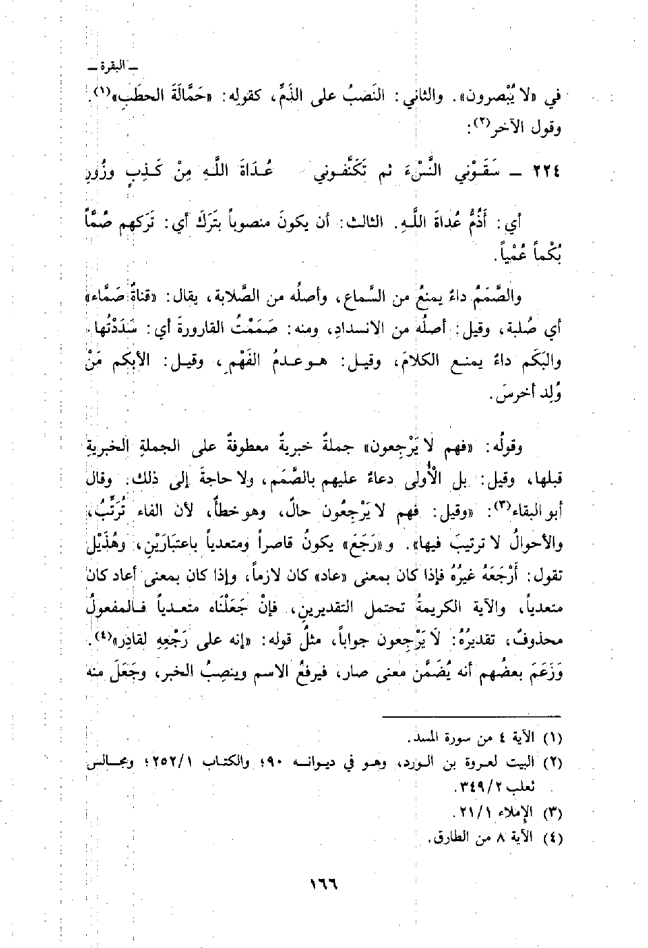 وقولُه: {فَهُمْ لاَ يَرْجِعُونَ} جملةٌ خبريةٌ معطوفةٌ على الجملةِ الخبريةِ قبلها، وقيل: بل الأُولى دعاءٌ عليهم بالصَّمَم، ولا حاجةَ إلى ذلك. وقال أبو البقاء: «وقيل: فهم لا يَرْجِعُون حالٌ، وهو خطأٌ، لأن الفاء تُرَتِّبُ، والأحوالُ لا ترتيبَ فيها» . و «رَجَعَ» يكونُ قاصراً ومتعدياً باعتبَارَيْنِ، وهُذَيْل تقول: أَرْجَعَهُ غيرُهُ فإذا كان بمعنى «عاد» كان لازماً، وإذا كان بمعنى أعاد كان متعدياً، والآية الكريمةُ تحتمل التقديرينِ، فإنْ جَعَلْنَاه متعدياً فالمفعولُ محذوفٌ، تقديرُهُ: لاَ يَرْجِعُون جواباً، مثلُ قوله: {إِنَّهُ على رَجْعِهِ لَقَادِرٌ} [الطارق: 8] . وَزَعَمَ بعضُهم أنه يُضَمَّن معنى صار، فيرفعُ الاسم وينصِبُ الخبر، وجَعَل منه