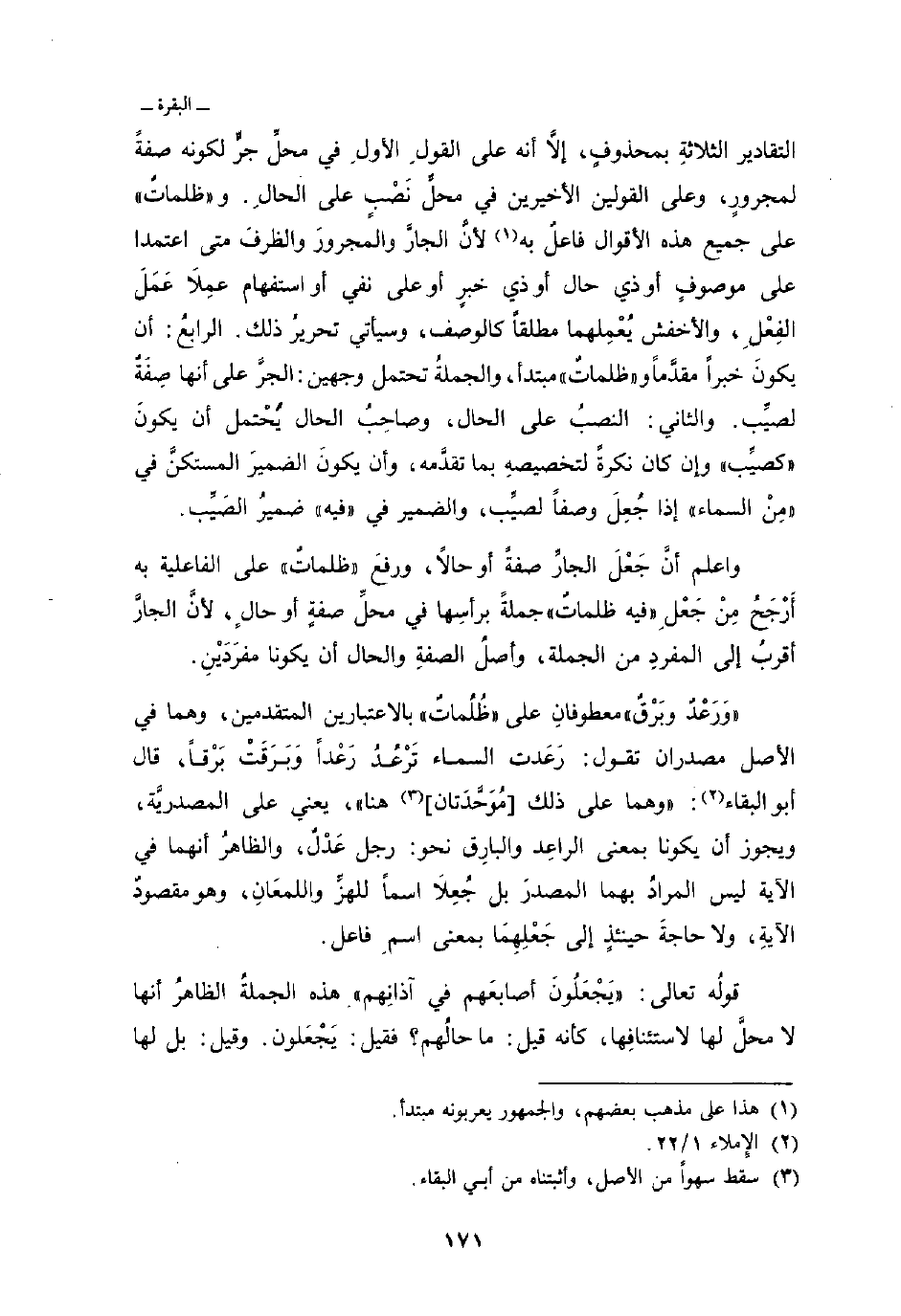 التقادير الثلاثة بمحذوفٍ، إلاَّ أنه على القولِ الأولِ في محلِّ جرٍّ لكونه صفةً لمجرورٍ، وعلى القولين الأخيرين في محلِّ نَصْبٍ على الحالِ. و «ظلماتٌ» على جميع هذه الأقوال فاعلٌ به لأنَّ الجارَّ والمجرورَ والظرفَ متى اعتمدا على موصوفٍ أو ذي حال أو ذي خبرٍ أو على نفي أو استفهام عمِلاَ عَمَلَ الفِعْلِ، والأخفش يُعْمِلهما مطلقاً كالوصف، وسيأتي تحريرُ ذلك. الرابعُ: أن يكونَ خبراً مقدَّماً و «ظلماتٌ» مبتدأ، والجملةُ تحتمل وجهين: الجرَّ على أنها صِفَةٌ لصيِّب. والثاني: النصبُ على الحال، وصاحِبُ الحال يُحْتمل أن يكونَ «كصيِّب» وإن كان نكرةً لتخصيصهِ بما تقدَّمه، وأن يكونَ الضميرَ المستكنَّ في «مِنْ السماء» إذا جُعِلَ وصفاً لصيِّب، والضمير في «فيه» ضميرُ الصَيِّب «.