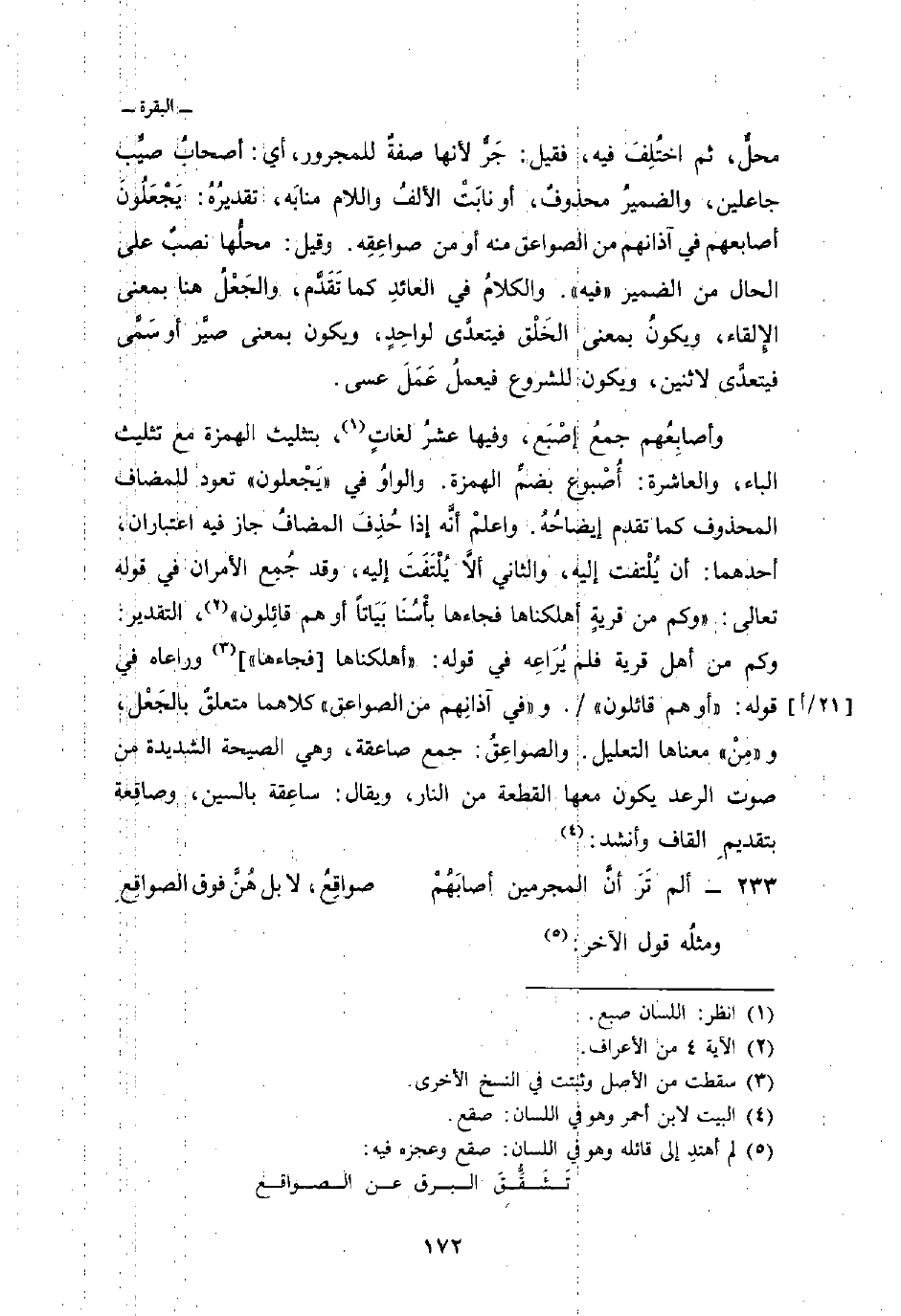 وأصابِعُهم جمعُ إصْبَع، وفيها عشرُ لغاتٍ، بتثليث الهمزة مع تثليث الباء، والعاشرة: أُصْبوع بضمِّ الهمزة. والواوُ في «يَجْعلون» تعود للمضاف المحذوف كما تقدم إيضاحُهُ. واعلمْ أنَّه إذا حُذِفَ المضافُ جاز فيه اعتباران، أحدهما: أن يُلْتفت إليه، والثاني ألاَّ يُلْتَفَتَ إليه، وقد جُمِع الأمران في قوله تعالى: {وَكَم مِّن قَرْيَةٍ أَهْلَكْنَاهَا فَجَآءَهَا بَأْسُنَا بَيَاتاً أَوْ هُمْ قَآئِلُونَ} [الأعراف: 4] ، التقدير: وكم من أهل قرية فلم يُرَاعِه في قوله: {أَهْلَكْنَاهَا [فَجَآءَهَا} ] وراعاه في قوله: {أَوْ هُمْ قَآئِلُونَ} /. و {في آذَانِهِم مِّنَ الصواعق} كلاهما متعلقٌ بالجَعْل، و «مِنْ» معناها التعليل. والصواعِقُ: جمع صاعقة، وهي الصيحة الشديدة من صوت الرعد يكون معها القطعة من النار، ويقال: ساعِقة بالسين، وصاقِعة بتقديمِ القاف وأنشد: