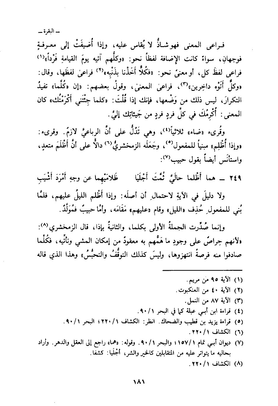 فراعى المعنى فهو شاذٌّ لا يُقاس عليه، وإذا أُضيفَتْ إلى معرفةٍ فوجهانِ، سواءً كانت الإِضافة لفظاً نحو: {وَكُلُّهُمْ آتِيهِ يَوْمَ القيامة فَرْداً} [مريم: 95] فراعى لفظَ كل، أو معنىً نحو: {فَكُلاًّ أَخَذْنَا بِذَنبِهِ} [العنكبوت: 40] فراعى لفظَها، وقال: {وَكُلٌّ أَتَوْهُ دَاخِرِينَ} [النمل: 87] ، فراعى المعنى، وقولُ بعضهم: إن «كُلَّما» تفيدُ التكرارَ، ليس ذلك من وَضْعها، فإنك إذا قُلْتَ: «كلما جِئْتَني أَكْرَمْتُك» كان المعنى: أُكْرِمُكَ في كلِّ فردٍ فردٍ من جَيئاتِكَ إليَّ.