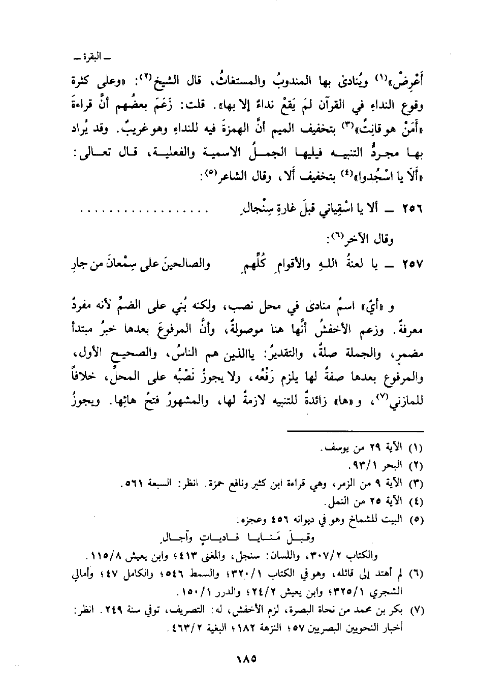 أَعْرِضْ} [يوسف: 29] وينادى بها المندوبُ والمستغاثُ، قال الشيخ: «وعلى كثرة وقوع النداءِ في القرآن لمَ يَقَعْ نداءٌ إلا بها» . قلت: زَعَمَ بعضُهم أنَّ قراءةَ {أَمَنْ هُوَ قَانِتٌ} [الزمر: 9] بتخفيف الميم أنَّ الهمزةَ فيه للنداءِ وهو غريبٌ. وقد يُراد بها مجردُّ التنبيه فيليها الجملُ الاسمية والفعلية، قال تعالى: {أَلاَ يا اسْجُدوا} [النمل: 25] بتخفيف أَلا، وقال الشاعر: