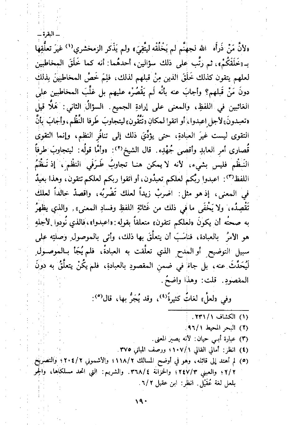 لأنَّ مَنْ ذَرأَه الله لجهنَّم لم يَخْلُقْه ليتَّقِيَ «ولم يَذْكر الزمخشري غيرَ تعلُّقِها ب» خَلَقَكُمْ «، ثم رتَّب على ذلك سؤالين، أحدُهما: أنه كما خَلَقَ المخاطبين لعلهم يتقون كذلك خَلَقَ الذين مِنْ قبلهم لذلك، فلِمَ خَصَّ المخاطبينَ بذلك دونَ مَنْ قَبلهم؟ وأجابَ عنه بأنَّه لَم يَقْصُرْه عليهم بل غلَّبَ المخاطبين على الغائبين في اللفظِ، والمعنى على إرادةِ الجميع. السؤالُ الثانِي: هَلاَّ قيل» تعبدونَ «لأجلِ اعبدوا، أو اتقوا لمكانِ» تَتَّقُون «ليتجاوبَ طَرفا النَّظْم، وأجابَ بأنَّ التقوى ليست غيرَ العبادةِ، حتى يؤدِّيَ ذلك إلى تنافُرِ النظم، وإنما التقوى قُصارى أمرِ العابدِ وأقصى جُهْدِه. قال الشيخ:» وأمَّا قولُه: ليتجاوبَ طرفاً النَظْم فليس بشيء، لأنه لا يمكن هنا تجاوبُ طَرَفَي النظْمِ، إذ نَظْمُ اللفظ: اعبدوا ربَّكم لعلكم تعبدُون، أو اتقوا ربكم لعلكم تتقون، وهذا بعيدٌ في المعنى، إذ هو مثل: اضربْ زيداً لعلك تَضْربُه، واقصدْ خالداً لعلك تَقْصِدُه، ولا يَخْفَى ما في ذلك من غَثاثةِ اللفظِ وفسادِ المعنى «. والذي يظهرُ به صحتُه أن يكونَ» لعلكم تتقون «متعلقاً بقولِه:» اعبدوا «، فالذي نُودوا لأجلهِ هو الأمرُ بالعبادة، فناسَبَ أن يتعلَّقَ بها ذلك، وأتى بالموصولِ وصلتِه على سبيل التوضيحِ أو المدحِ الذي تعلَّقت به العبادةُ، فلم يُجَأ بالموصولِ لَيُحَدِّثَ عنه، بل جاءَ في ضمنِ المقصودِ بالعبادةِ، فلم يكُنْ يتعلَّقُ به دونَ المقصودِ. قلت: وهذا واضحٌ.