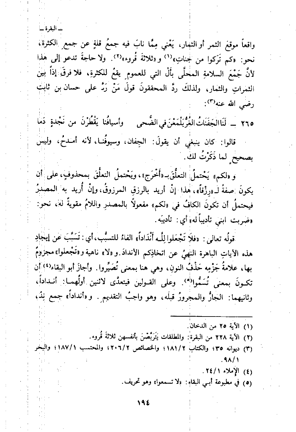 واقعاً موقعَ الثمر أو الثمار، يَعْني مِمَّا نابَ جمعُ قلةٍ عن جمعِ الكثرة، نحو: {كَمْ تَرَكُواْ مِن جَنَّاتٍ} [الدخان: 25] و {ثَلاَثَةَ قرواء} [البقرة: 228] . ولا حاجةَ تدعو إلى هذا لأنَّ جَمْعَ السلامةِ المحلَّى بأَلْ التي للعمومِ يقعُ للكثرةِ، فلا فرقَ إذاً بين الثمراتِ والثمار، ولذلكَ ردَّ المحققونَ قولَ مَنْ ردَّ على حسان بن ثابت رضي الله عنه: