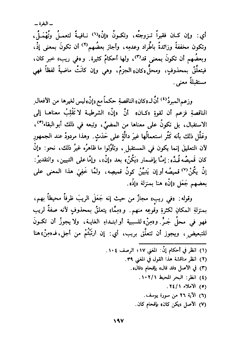 وزعم المبردُ أنَّ ل «كان» الناقصةِ حكماً مع «إنْ» ليس لغيرها من الأفعالِ الناقصةِ فزعم أن لقوةِ «كان» أنَّ «إنْ» الشرطية لا تَقْلِبُ معناها إلى الاستقبال، بل تكونُ على معناها من المضيِّ، وتبعه في ذلك أبو البقاء، وعَلَّلَ ذلك بأنه كثُر استعمالُها غيرَ دالَّةٍ على حَدَثٍ. وهذا مردودٌ عند الجمهورِ لأن التعليقَ إنما يكون في المستقبلِ، وتأوَّلوا ما ظاهرُه غيرُ ذلك، نحو: {إِن كَانَ قَمِيصُهُ قُدَّ} [يوسف: 26] : إمَّا بإضمار «يَكُنْ» بعد «إنْ» ، وإمَّا على التبيين، والتقديرُ: إنْ يكُنْ قميصُه أو إن يَتبيَّنْ كونُ قميصِه، ولمَّا خَفِيَ هذا المعنى على بعضهم جَعَل «إنْ» هنا بمنزلة «إذْ» .