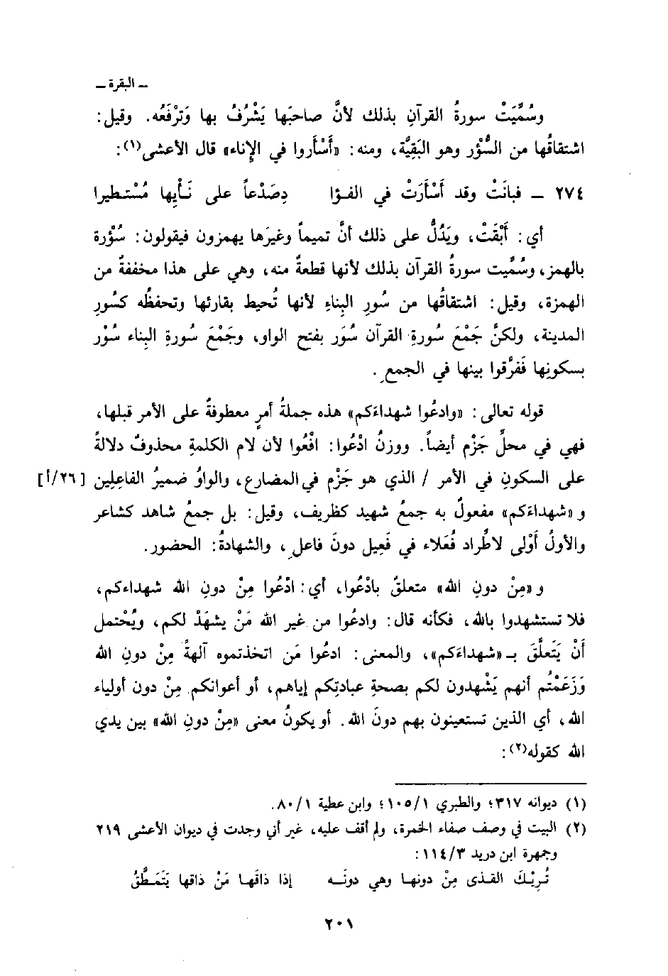 و {مِّن دُونِ الله} متعلقٌ بادْعُوا، أي: ادْعُوا مِنْ دونِ الله شهداءكم، فلا تستشهدوا بالله، فكأنه قال: وادعُوا من غير الله مَنْ يشهَدْ لكم، ويُحتمل أَنْ يَتَعَلَّقَ ب» شهداءَكم «، والمعنى: ادعُوا مَن اتخذتموه آلهةً مِنْ دونِ الله وَزَعَمْتُم أنهم يَشْهدون لكم بصحةِ عبادتِكم إياهم، أو أعوانكم مِنْ دون أولياء الله، أي الذين تستعينون بهم دونَ الله. أو يكونُ معنى» مِنْ دونِ الله «بين يدي الله كقوله: