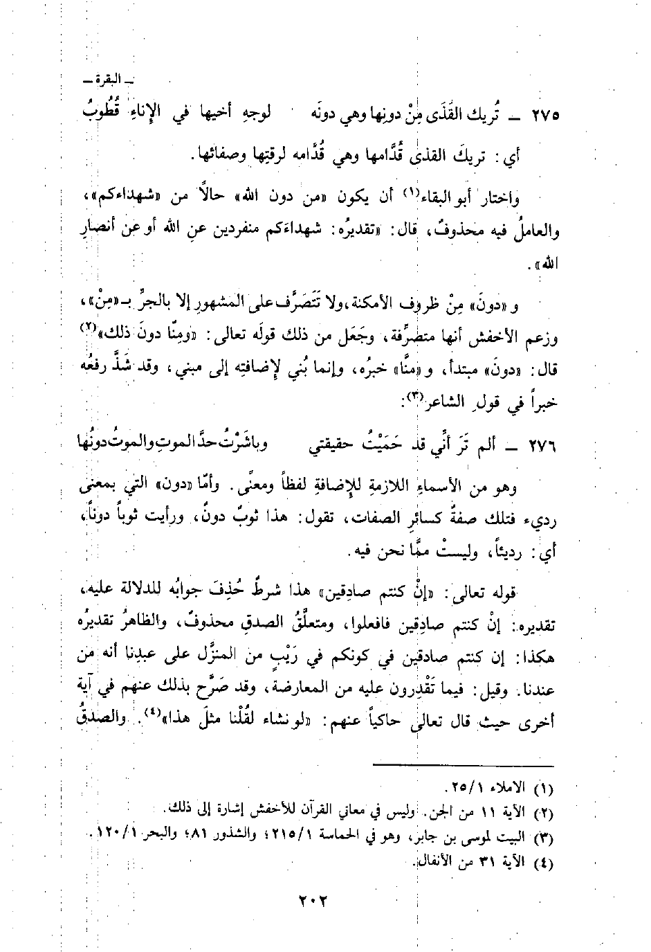 و» دونَ «مْنِ ظروف الأمكنة، ولا تَتَصَرَّف على المشهورِ إلا بالجرِّ ب» مِنْ «، وزعم الأخفش أنها متصرِّفة، وجَعَل من ذلك قولَه تعالى: {وَمِنَّا دُونَ ذَلِكَ} [الجن: 11] قال:» دونَ «مبتدأ، و» منَّا «خبرُه، وإنما بُني لإِضافتِه إلى مبني، وقد شَذَّ رفعُه خبراً في قولِ الشاعر: