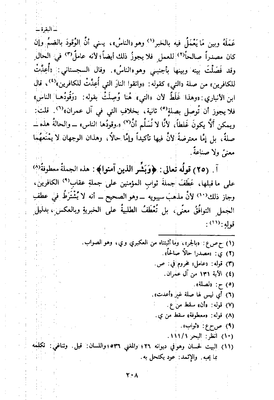 عَمَلَهُ وبين مَا يَعْمَلُ فيه بالخبر وهو» الناسُ «، يعني أنَّ الوُقودَ بالضمِّ وإن كان مصدراً صالحاً للعملِ فلا يجوزُ ذلك أيضاً؛ لأنه عاملٌ في الحالِ وقد فَصَلْتَ بينه وبينها بأجنبي وهو» الناسُ «. وقال السجستاني: {أُعِدَّتْ لِلْكَافِرِينَ} من صلة» التي «كقوله: {واتقوا النار التي أُعِدَّتْ لِلْكَافِرِينَ} [آل عمران: 131] ، قال ابن الأنباري:» وهذا غَلَطٌ لأن «التي» هُنا وُصِلَتْ بقوله: {وَقُودُهَا الناس} فلا يجوز أن تُوصل بصلةٍ ثانية، بخلافِ التي في آل عمران. قلت: ويمكن ألاَّ يكون غَلطاً، لأنَّا لا نُسَلِّم أنَّ {وَقُودُهَا الناس} والحالةُ هذه صلةٌ، بل إمَّا معترضةً لأنَّ فيها تأكيداً وإمَّا حالاً، وهذان الوجهان لا يَمْنَعهُما معنىً ولا صناعةً.