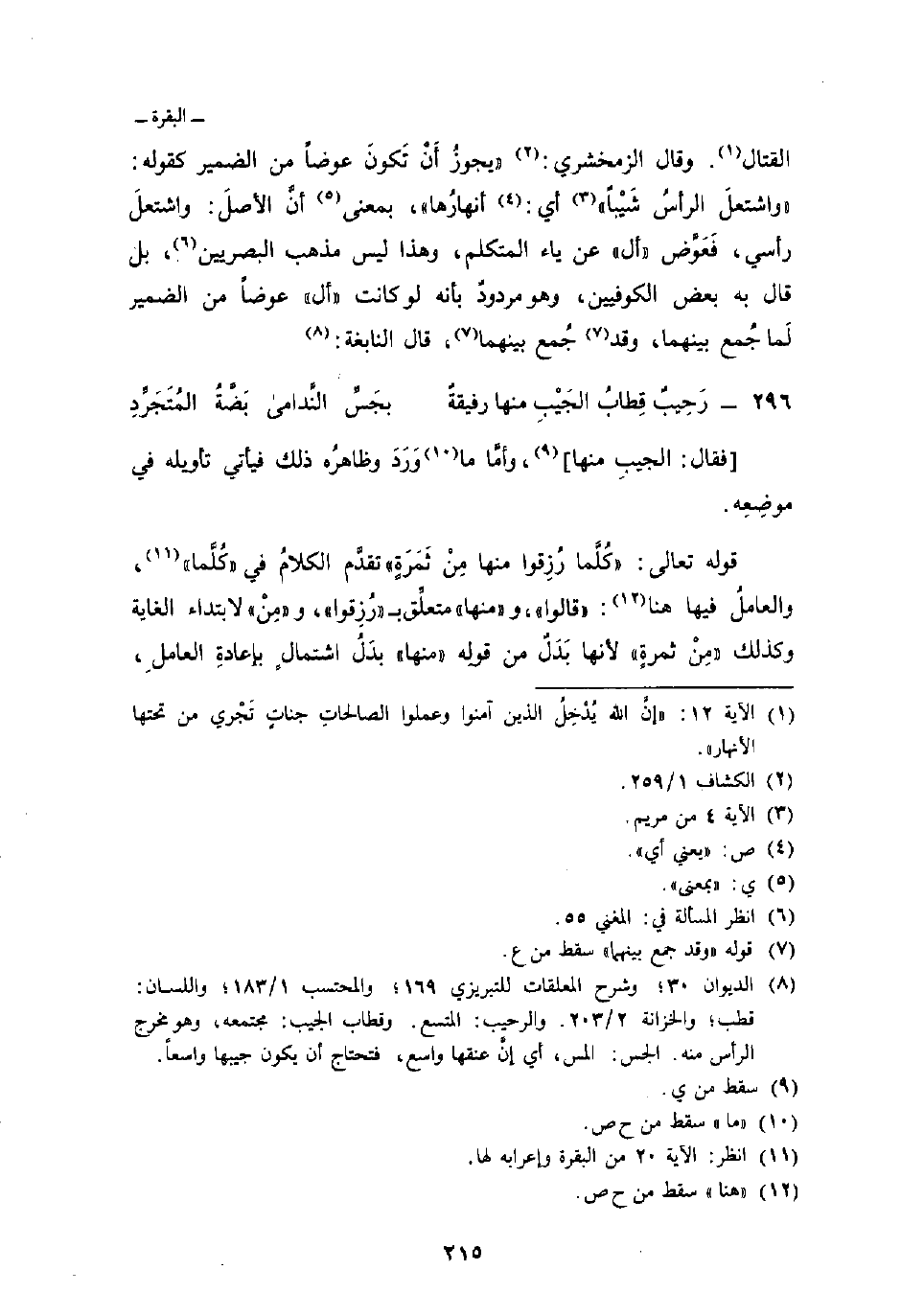 القتال. وقال الزمخشري:» يجوزُ أَنْ تَكونَ عوضاً من الضمير كقوله: {واشتعل الرأس شَيْباً} [مريم: 4] أي: أنهارُها «، بمعنى أنَّ الأصلَ: واشتعلَ رأسي، فَعَوَّض» أل «عن ياء المتكلم، وهذا ليس مذهب البصريين، بل قال به بعض الكوفيين، وهو مردودٌ بأنه لو كانت» أل «عوضاً من الضمير لَما جُمع بينهما، وقد جُمع بينهما، قال النابغة: