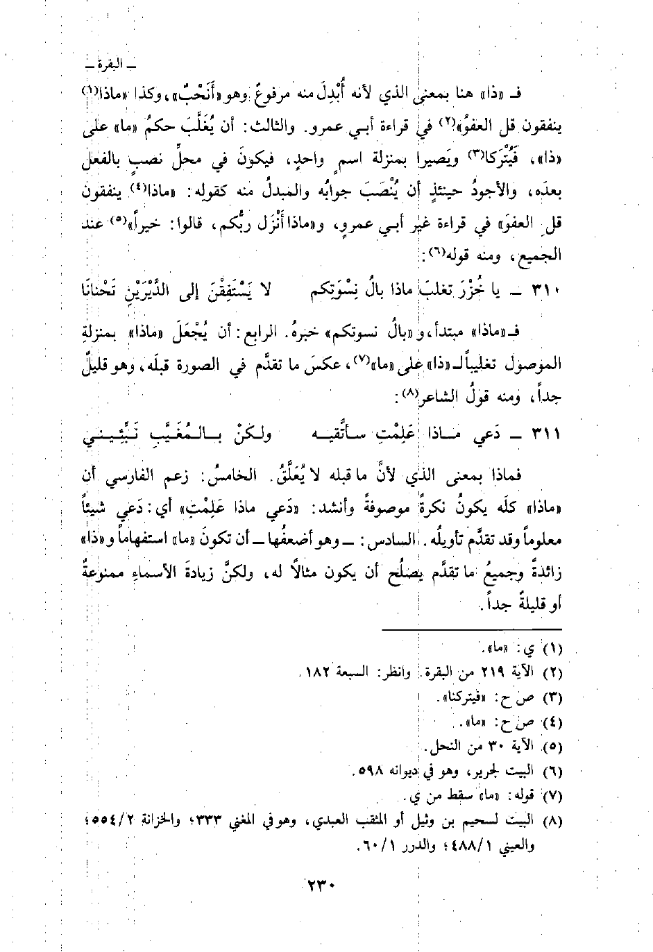 فماذا بمعنى الذي لأنَّ ما قبله لا يُعَلَّقُ. الخامسُ: زعم الفارسي أن» ماذا «كلَه يكونُ نكرةً موصوفةً وأنشد:» دَعي ماذا عَلِمْتِ «أي: دَعي شيئاً معلوماً وقد تقدَّم تأويلُه. السادس: وهو أضعفُها أن تكونَ» ما «استفهاماً و» ذا «زائدةً وجميعُ ما تقدَّم يصلُح أن يكون مثالاً له، ولكنَّ زيادةَ الأسماءِ ممنوعةٌ أو قليلةٌ جداً.