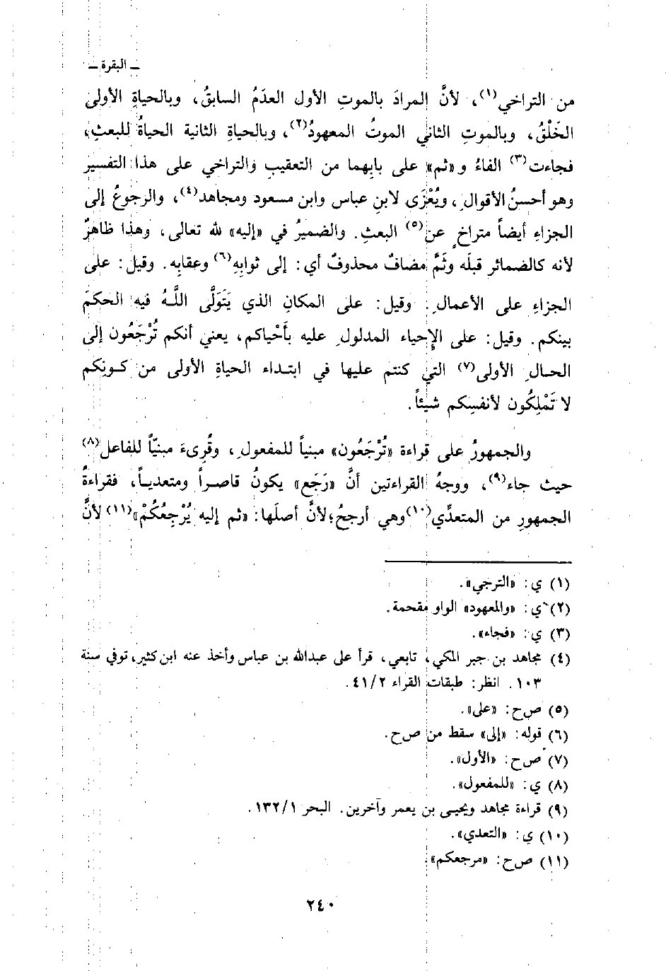 من التراخي، لأنَّ المرادَ بالموتِ الأول العدَمُ السابقُ، وبالحياةِ الأولى الخَلْقُ، وبالموتِ الثاني الموتُ المعهودُ، وبالحياةِ الثانية الحياةُ للبعثِ، فجاءت الفاءُ و» ثم «على بابِهما من التعقيبِ والتراخي على هذا التفسير وهو أحسنُ الأقوالِ، ويُعْزَى لابنِ عباس وابن مسعود ومجاهد، والرجوعُ إلى الجزاءِ أيضاً متراخٍ عن البعثِ. والضميرُ في» إليه «لله تعالى، وهذا ظاهرٌ لأنه كالضمائر قبلَه وثَمَّ مضافٌ محذوفٌ أي: إلى ثوابِهِ وعقابِه. وقيل: على الجزاءِ على الأعمالِ. وقيل: على المكانِ الذي يَتَوَلَّى اللهُ فيه الحكمَ بينكم. وقيل: على الإِحياء المدلولِ عليه بأَحْياكم، يعني أنكم تُرْجَعُون إلى الحالِ الأولى التي كنتم عليها في ابتداء الحياةِ الأولى من كونِكم لا تَمْلِكُون لأنفسِكم شيئاً.