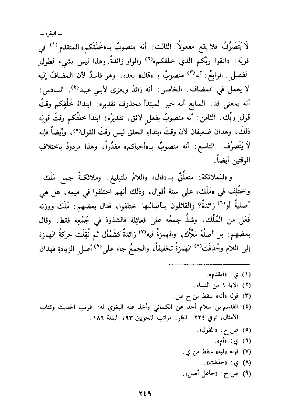 لاَ يَتَصَرَّفُ فلا يقع مفعولاً. الثالث: أنه منصوبٌ ب «خَلَقَكم» المتقدمِ في قولِه: {اتقوا رَبَّكُمُ الذي خَلَقَكُمْ} [النساء: 1] والواو زائدةٌ. وهذا ليس بشيء لطولِ الفصلِ. الرابعُ: أنه منصوبٌ ب «قال» بعده. وهو فاسدٌ لأن المضافَ إليه لا يعمل في المضاف. الخامس: أنه زائدٌ ويعزى لأبي عبيد. السادس: أنه بمعنى قد. السابع أنه خبر لمبتدأ محذوف تقديره: ابتداءُ خَلْقِكم وقتُ قولِ ربِّك. الثامن: أنه منصوبٌ بفعلٍ لائق، تقديرُه: ابتدأ خلقُكم وقتَ قولِه ذلكَ، وهذان ضعيفان لأن وقتَ ابتداءِ الخلق ليس وقتَ القول، وأيضاً فإنه لاَ يَتَصرَّف. التاسع: أنه منصوبٌ ب «أحياكم» مقدَّراً، وهذا مردودٌ باختلافِ الوقتين أيضاً.