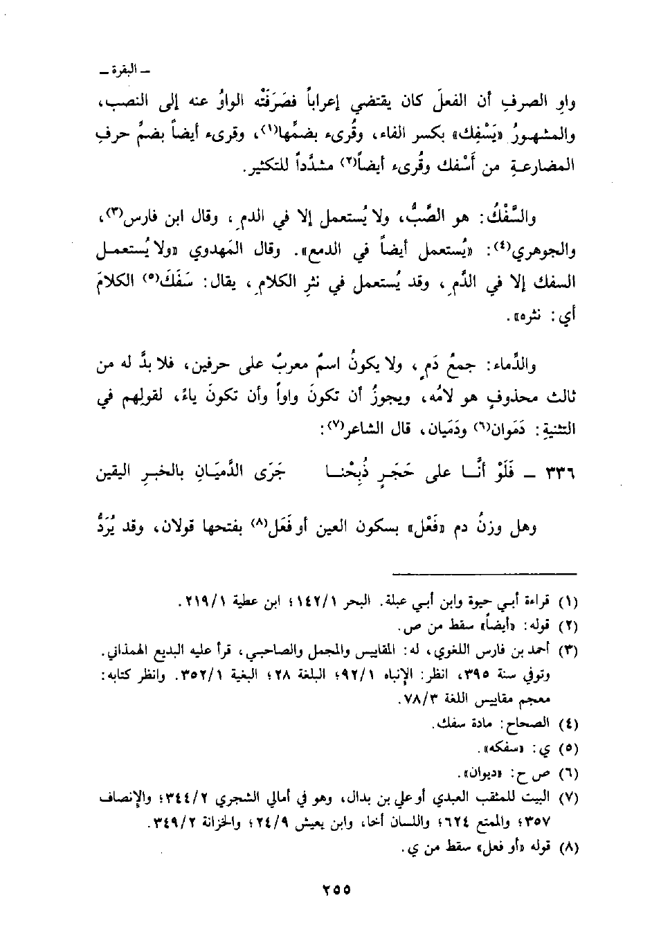 والدِّماء: جمعُ دَمٍ، ولا يكونُ اسمٌ معربٌ على حرفين، فلا بدَّ له من ثالث محذوفٍ هو لامُه، ويجوزُ أن تكونَ واواً وأن تكونَ ياءً، لقولِهم في التثنيةِ: دَمَوان ودَمَيان، قال الشاعر: