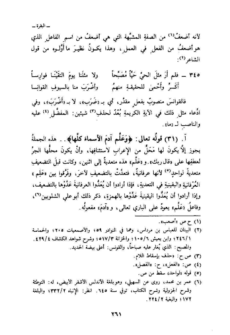 قولُه تعالى: {وَعَلَّمَ آدَمَ الأسمآء كُلَّهَا} . . هذه الجملةُ يجوز إلاَّ يكونَ لها مَحَلٌّ من الإِعرابِ لاستئنافِها، وأنْ يكونَ محلُّها الجرَّ لعطفِها على «قال ربك» . و «عَلَّم» هذه متعديةٌ إلى اثنين، وكانت قبلَ التضعيفِ متعديةً لواحدٍ لأنها عرفانيةٌ، فتعدَّت بالتضعيفِ لآخرَ، وفَرَّقوا بين «عَلِم» العُرْفانيةِ واليقينيةِ في التعديةِ، فإذا أرادوا أن يُعَدُّوا العرفانيةَ عَدَّوْها بالتضعيف، وإذا أرادوا أن يُعَدُّوا اليقينيةَ عَدَّوْها بالهمزةِ، ذكر ذلك أبو علي علي الشلوبين، وفاعلُ «عَلَّم» يعودُ على الباري تعالى، و «آدمَ» مفعولُه.