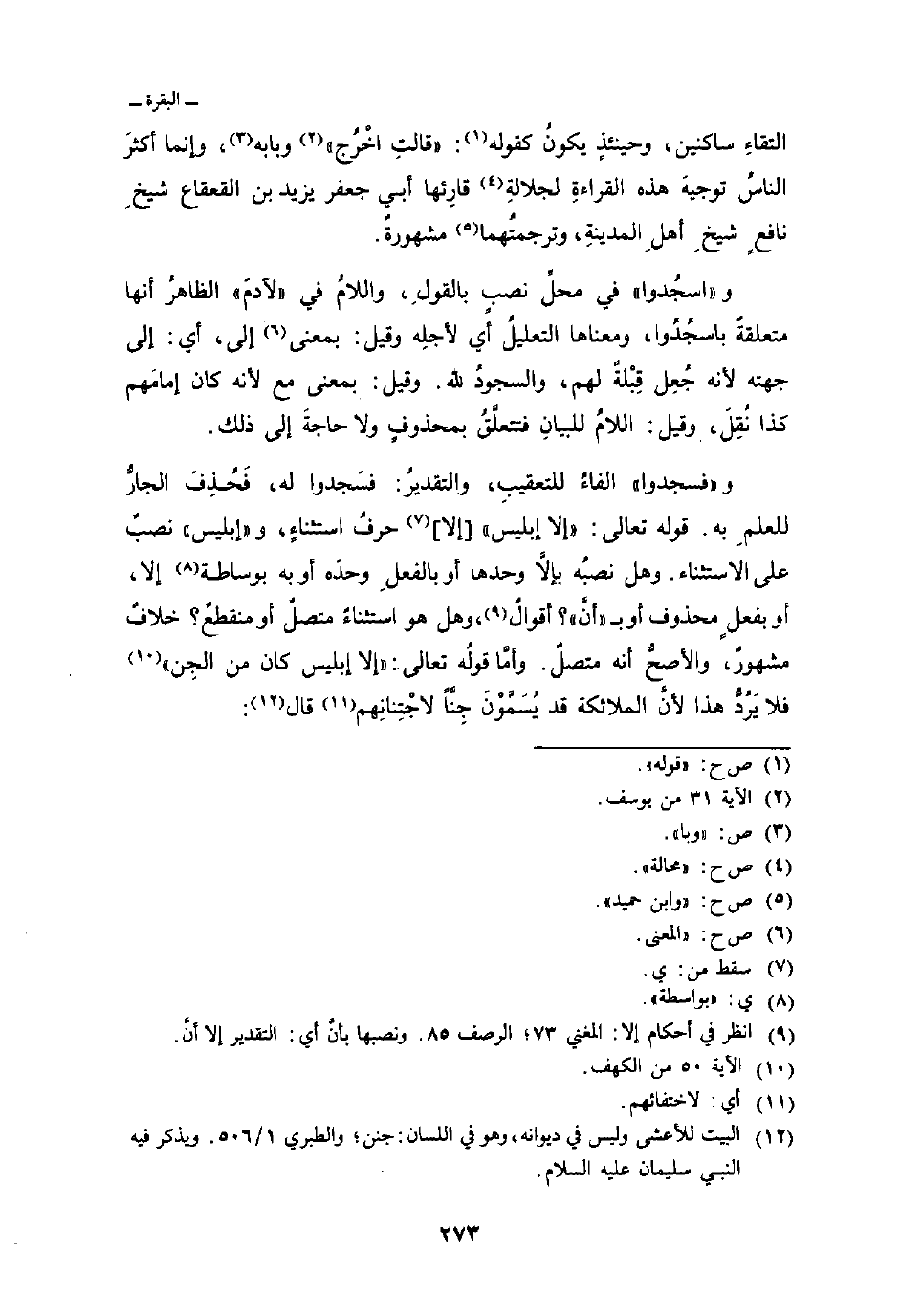 و «فسجدوا» الفاءُ للتعقيبِ، والتقديرُ: فسَجدوا له، فَحُذِفَ الجارُّ للعلمِ به. قوله تعالى: {إِلاَّ إِبْلِيسَ} [إلا] حرفُ استثناءٍ، و «إبليس» نصبٌ على الاستثناء.