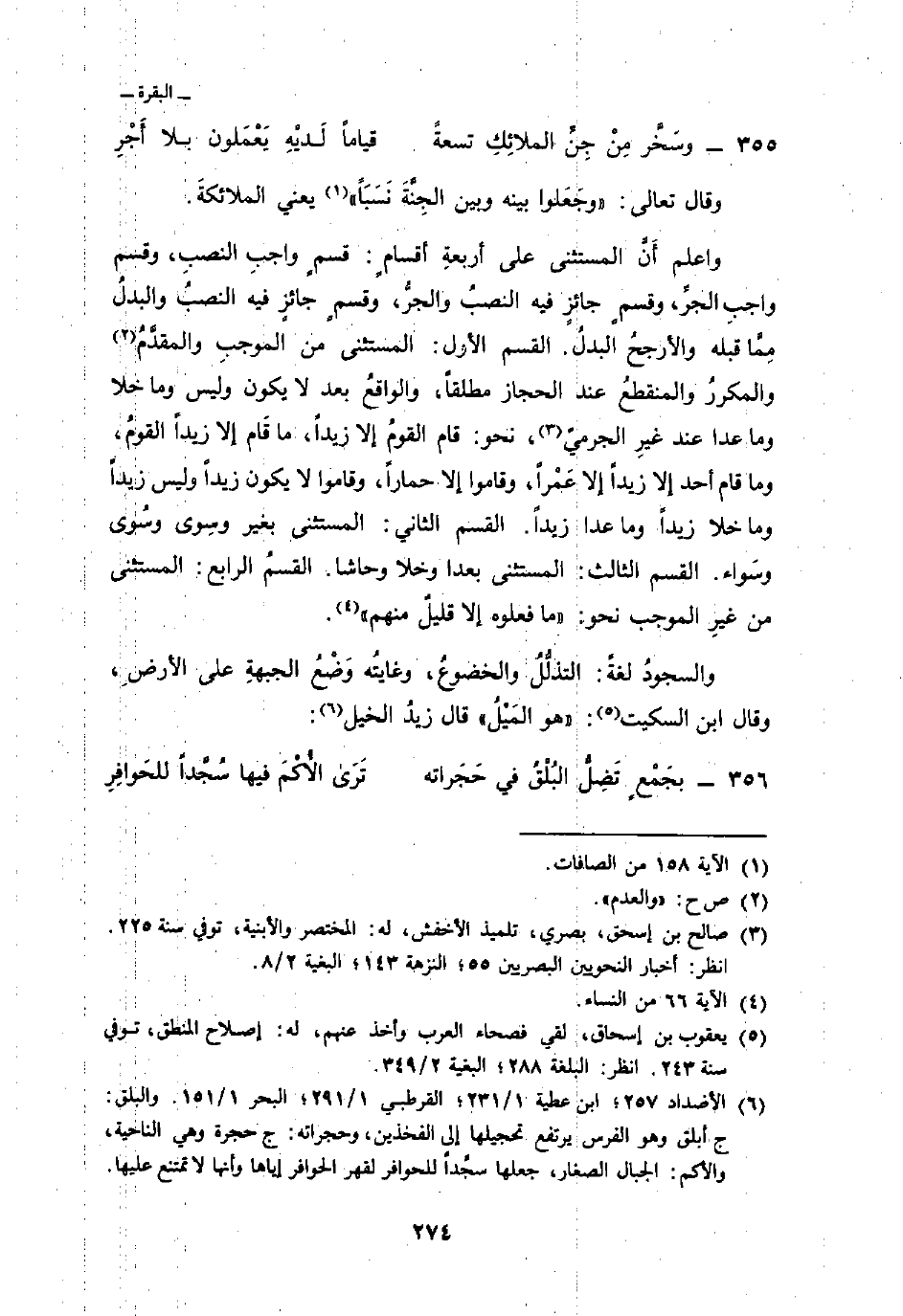 واعلم أَنَّ المستثنى على أربعةِ أقسامٍ: قسمٍ واجبِ النصبِ، وقسم واجبِ الجرِّ، وقسمٍ جائزٍ فيه النصبُ والجرُّ، وقسمٍ جائزٍ فيه النصبُ والبدلُ مِمَّا قبله والرجحُ البدلُ. القسم الأول: المستثنى من الموجبِ والمقدَّمُ والمكررُ والمنقطعُ عند الحجاز مطلقاً، والواقعُ بعد لا يكون وليس ما خلا وما عدا عند غيرِ الجرميّ، نحو: قام القومُ إلا زيداً، ما قَام إلا زيداً القومُ، وما قام أحد إلا زيداً إلا عَمْراً، وقاموا إلا حماراً، وقاموا لا يكون زيداً وليس زيداً وما خلا زيداً وما عدا زيداً. القسم الثاني: المستثنى بغير وسِوى وسُوى وسَواء. القسم الثالث: المستثنى بعدا وخلا وحاشا. القسمُ الرابع: المستثنى من غيرِ الموجب نحو: {مَّا فَعَلُوهُ إِلاَّ قَلِيلٌ مِّنْهُمْ} [النساء: 66] .