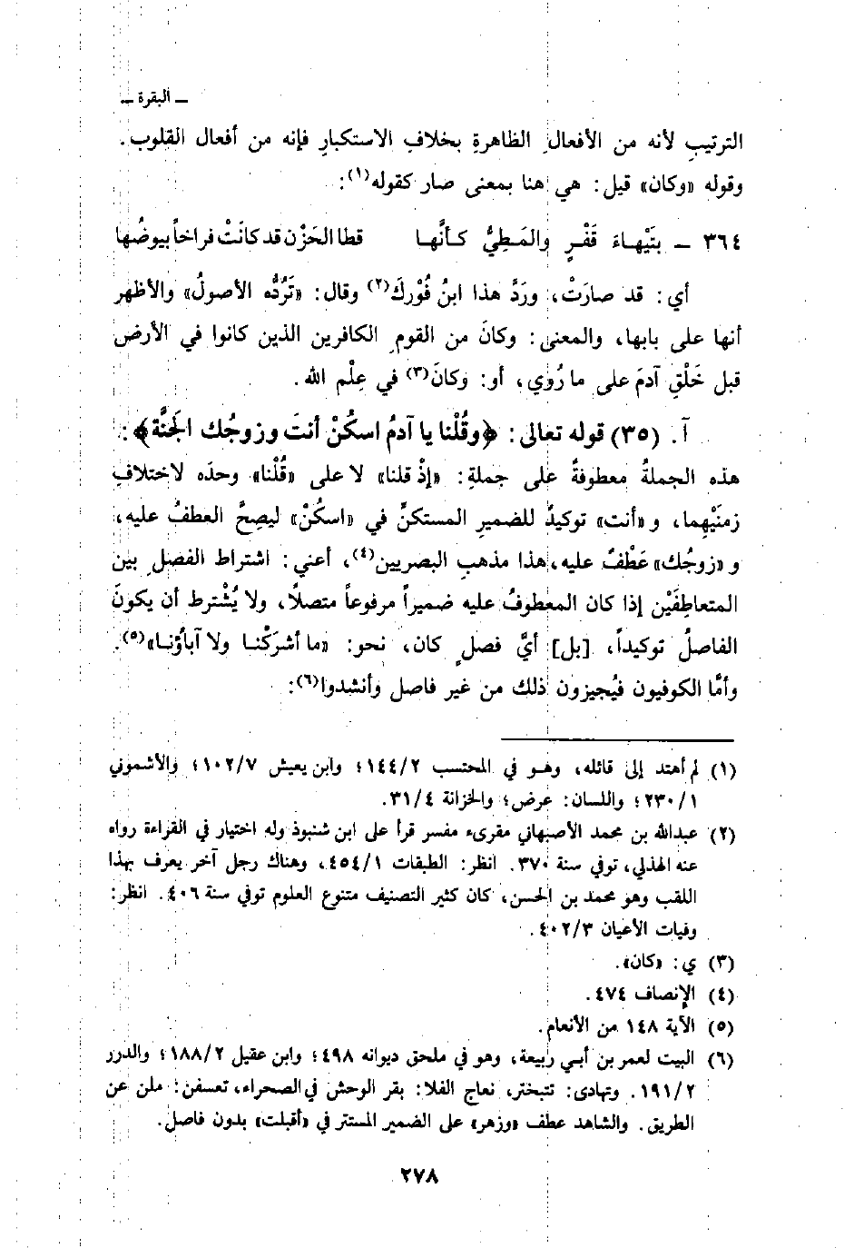 قوله تعالى: {وَقُلْنَا يَاآدَمُ اسكن أَنْتَ وَزَوْجُكَ الجنة} : هذه الجملةُ معطوفةٌ على جملةِ: «إذْ قلنا» لا على «قُلْنا» وحدَه لاختلافِ زمنَيْهِما، و «أنت» توكيدٌ للضميرِ المستكنِّ في «اسكُن» ليصِحَّ العطفُ عليه، و «زوجُك» عَطْفٌ عليه، هذا مذهبِ البصريين، أعني: اشتراط الفصلِ بين المتعاطِفَيْن إذا كان المعطوفُ عليه ضميراً مرفوعاً متصلاً، ولا يُشْترط أن يكونَ الفاصلُ توكيداً، [بل] أيَّ فصلٍ كان، نحو: {مَآ أَشْرَكْنَا وَلاَ آبَاؤُنَا} [الأنعام: 148] . وأمَّا الكوفيون فيُجيزون ذلك من غير فاصل وأنشدوا:
