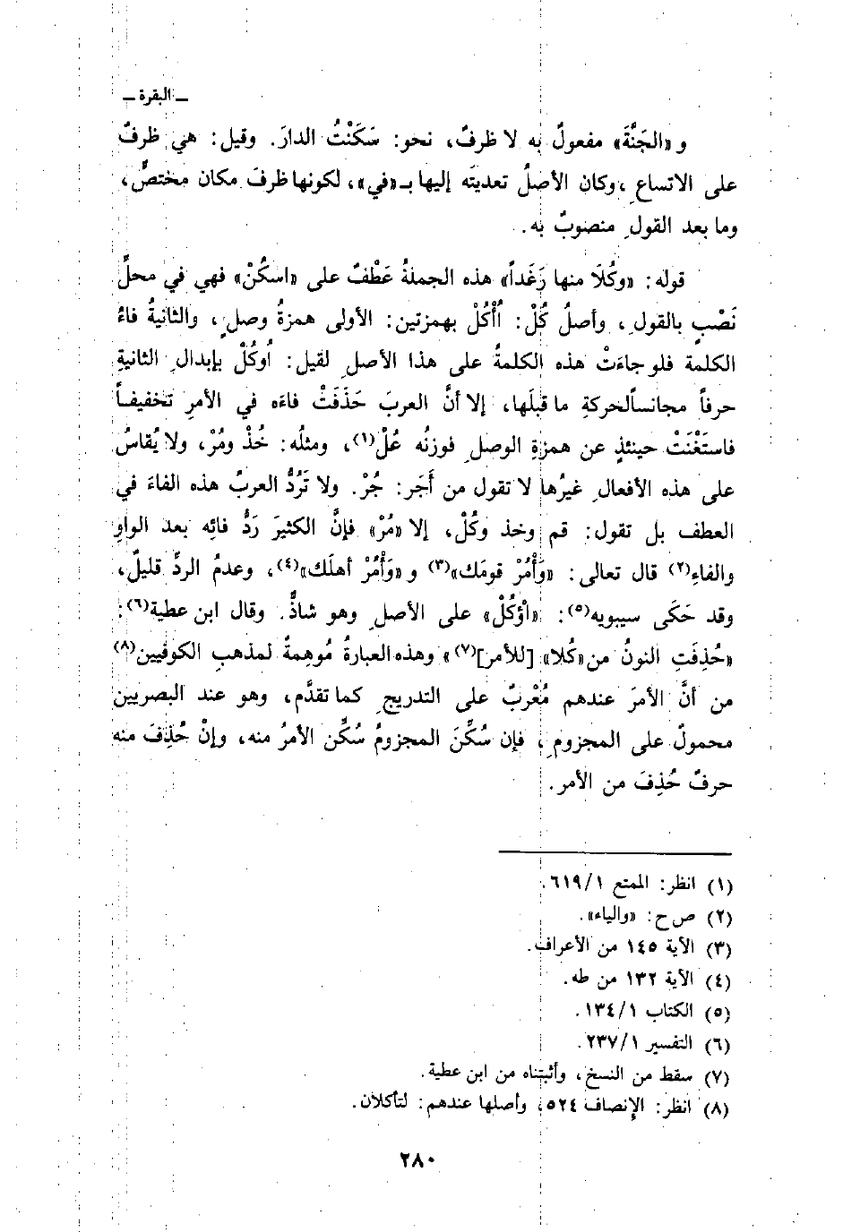 وقال ابن عطية: «حُذِفَتِ النونُ من» كُلا « [للأمر] » وهذه العبارةُ مُوهِمةٌ لمذهبِ الكوفيين من أنَّ الأمرَ عندهم مُعْربٌ على التدريجِ كما تقدَّم، وهو عند البصريين محمولٌ على المجزومِ، فإن سُكِّنَ المجزومُ سُكِّن الأمرُ منه، وإنْ حُذِفَ منه حرفٌ حُذِفَ من الأمر.