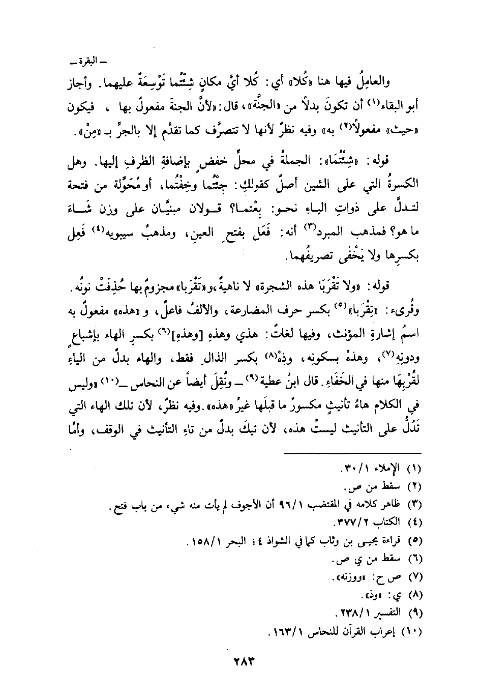 قوله: {وَلاَ تَقْرَبَا هذه الشجرة} لا ناهيةٌ، و «تَقْرَبا» مجزومٌ بها حُذِفَتْ نونُه. وقُرئ: «تِقْرَبا» بكسر حرف المضارعة، والألفُ فاعلٌ، و «هذه» مفعولٌ به اسمُ إشارةِ المؤنث، وفيها لغاتٌ: هذي وهذهِ [وهذهِ] بكسرِ الهاء بإشباعٍ ودونِهِ، وهذهْ بسكونِه، وذِهْ بكسر الذالِ فقط، والهاءُ بدلٌ من الياءِ لقُرْبِهَا منها في الخَفَاءِ. قال ابنُ عطية ونُقِلَ أيضاً عن النحاس «وليس في الكلام هاءُ تأنيثٍ مكسورٌ ما قبلَها غيرُ» هذه «. وفيه نظرٌ، لأن تلك الهاء التي تَدُلُّ على التأنيث ليستْ هذه، لأن تيكَ بدلٌ من تاءِ التأنيث في الوقف، وأمَّا