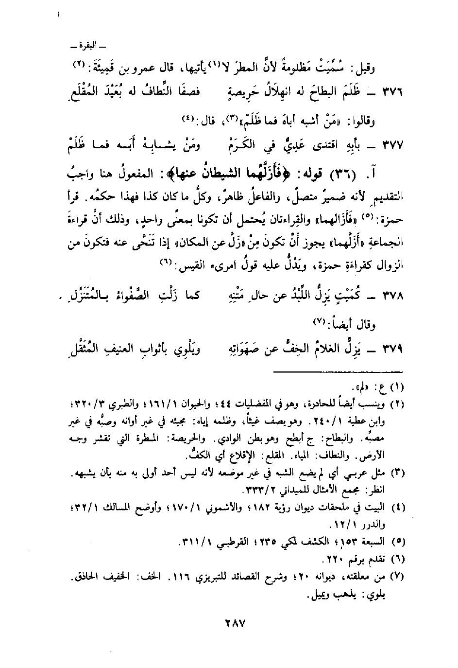 قوله: {فَأَزَلَّهُمَا الشيطان عَنْهَا} : المفعولُ هنا واجبُ التقديمِ لأنه ضميرٌ متصلٌ، والفاعلُ ظاهرٌ، وكلُّ ما كان كذا فهذا حكمُه. قرأ حمزة: «فَأَزَالهما» والقِراءتان يُحتمل أن تكونا بمعنىً واحدٍ، وذلك أنَّ قراءةَ الجماعةِ «أَزَلَّهما» يجوز أَنْ تكونَ مِنْ «زَلَّ عن المكان» إذا تَنَحَّى عنه فتكونَ من الزوالِ كقراءَةِ حمزة، ويَدُلُّ عليه قولُ امرئ القيس: