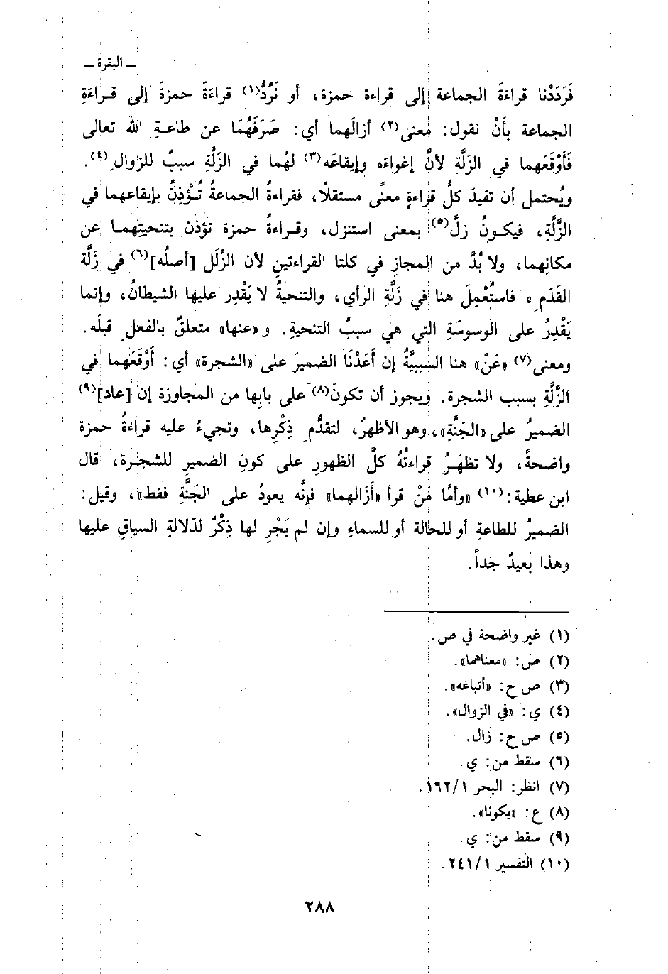 فَرَدَدْنا قراءَة الجماعة إلى قراءة حمزة، أو نَرُدُّ قراءَةَ حمزةَ إلى قراءَةِ الجماعة بأَنْ نقول: معنى أزالَهما أي: صَرَفَهُمَا عن طاعةِ الله تعالى فَأَوْقَعَهما في الزَلَّةِ لأنَّ إغواءَه وإيقاعَه لهُما في الزَلَةِ سببُ للزوالِ. ويُحتمل أن تفيدَ كلُّ قراءةٍ معنًى مستقلاً، فقراءةُ الجماعةُ تُؤْذِنُ بإيقاعهما في الزَّلَّةِ، فيكونُ زلَّ استنزل، وقراءةُ حمزة تؤذن بتنحيتِهما عن مكانِهما، ولا بُدَّ من المجازِ في كلتا القراءتينِ لأن الزَّلَل [أصلُه] في زَلَّة القَدَمِ، فاستُعْمِلَ هنا في زَلَّةِ الرأي، والتنحيةُ لا يَقْدِر عليها الشيطانُ، وإنما يَقْدِرُ على الوسوسَةِ التي هي في زَلَّة الرأي، والتحيةُ لا يقْدِر عليها الشيطانُ، وإنما يَقْدِرُ على الوسوسَةِ التي هي سببُ التنحيةِ. و «عنها» متعلقٌ بالفعلِ قبلَه. ومعنى «عَنْ» هنا السببيَّةُ إن أَعَدْنَا الضميرَ على «الشجرة» أي: أَوْقَعَهما في الزَّلَّةِ بسبب الشجرة. ويجوز أن تكونَ على بابِها من المجاوزة إن [عاد] الضميرُ على «الجَنَّةِ» ، وهو الأظهرُ، لتقدُّمِ ذِكْرِها، وتجيءُ عليه قراءةُ حمزة واضحةً، ولا تظهَرُ قراءتُهُ كلَّ الظهورِ على كونِ الضميرِ للشجرة، قال ابن عطية: «وأمَّا مَنْ قرأ» أَزَالهما «فإنَّه يعودُ على الجَنَّةِ فقط» ، وقيل: الضميرُ للطاعةِ أو للحالة أو للسماءِ وإن لم يَجْرِ لها ذِكْرٌ لدَلالةِ السياقِ عليها وهذا بعيدٌ جداً.
