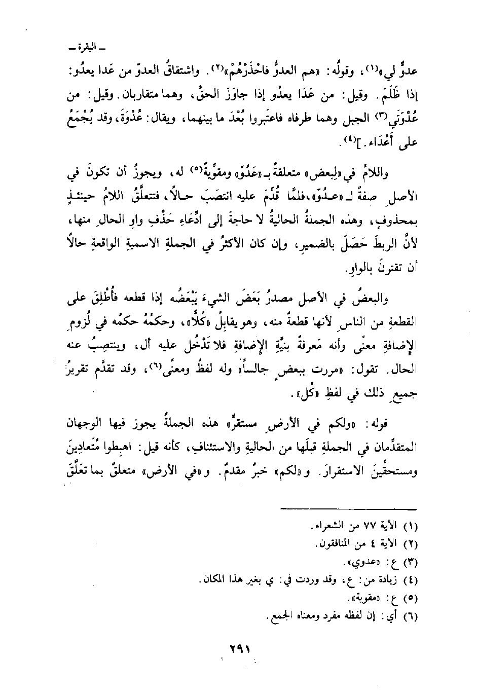 عَدُوٌّ لي} [الشعراء: 77] ، وقولُه: {هُمُ العدو فاحذرهم} [المنافقون: 4] . واشتقاقُ العدوّ من عَدا يعدُو: إذا ظَلَمَ. وقيل: من عَدَا يعدُو إذا جاوَزَ الحقَّ، وهما متقاربان. وقيل: من عُدْوَتَي الجبل وهما طرفاه فاعتَبروا بُعْدَ ما بينهما، ويقال: عُدْوَةَ، وقد يُجْمَعُ على أَعْدَاء.] .