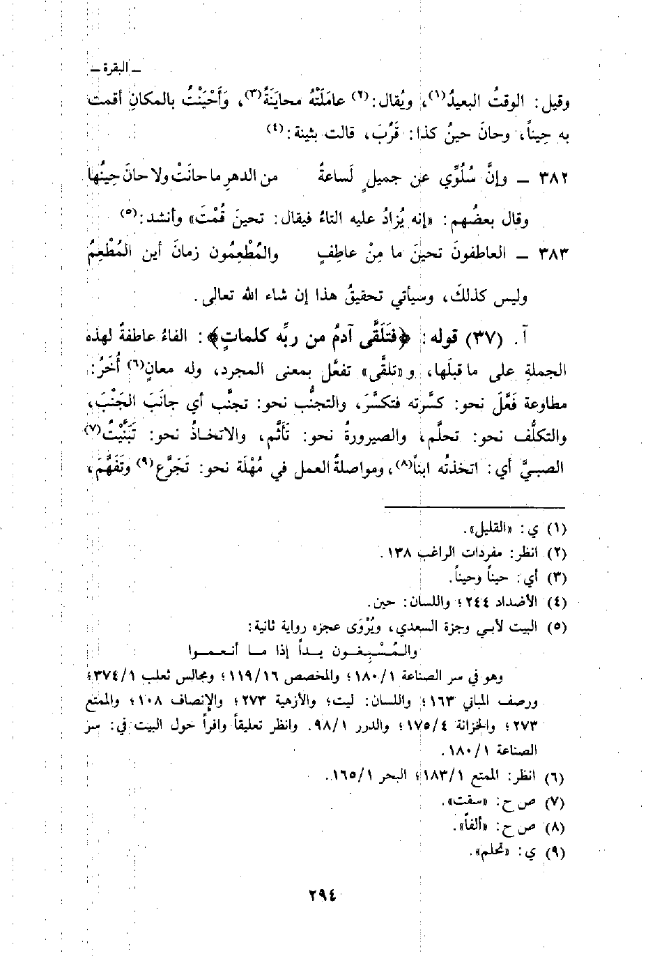 قوله: {فتلقى آدَمُ مِن رَّبِّهِ كَلِمَاتٍ} : الفارُ عاطفةٌ لهذه الجملةِ على ما قبلَها، و «تلقَّى» تفعَّل بمعنى المجرد، وله معانٍ أُخَرُ: مطاوعة فَعَّلَ نحو: كسَّرته فتكسَّرَ، والتجنُّب نحو: تجنَّب أي جانَبَ الجَنْبَ، والتكلُّف نحو: تحلَّم، والصيرورةُ نحو: تَأثَّم، والاتخاذُ نحو: تَبَنَّيْتُ الصبيَّ أي: اتخذتُه ابناً، ومواصلةُ العمل في مُهْلَة نحو: تَجَرَّع وتَفَهَّمَ،