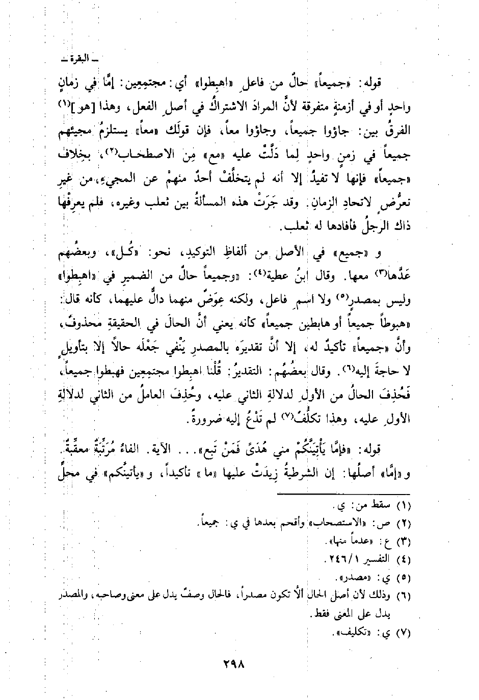 قوله: «جميعاً» حالٌ من فاعلِ «اهبِطوا» أي: مجتمِعِين: إمَّا في زمانٍ واحدٍ أو في أزمنةٍ متفرقة لأنَّ المرادَ الاشتراكُ في أصلِ الفعل، وهذا [هو] الفرقُ بين: جاؤوا جميعاً، وجاؤوا معاً، فإن قولَك «معاً» يستلزمُ مجيئهم جميعاً في زمنٍ واحدٍ لِما دَلَّتْ عليه «مع» مِن الاصطحاب، بخِلاف «جميعاً» فإنها لا تفيدُ إلا أنه لم يتخلَّفْ أحدٌ منهمْ عن المجيءِ، من غيرِ تعرُّضٍ لاتحادِ الزمانِ. وقد جَرَتْ هذه المسألةُ بين ثعلب وغيره، فلم يعرِفْها ذاك الرجلُ فأفادها له ثعلب.