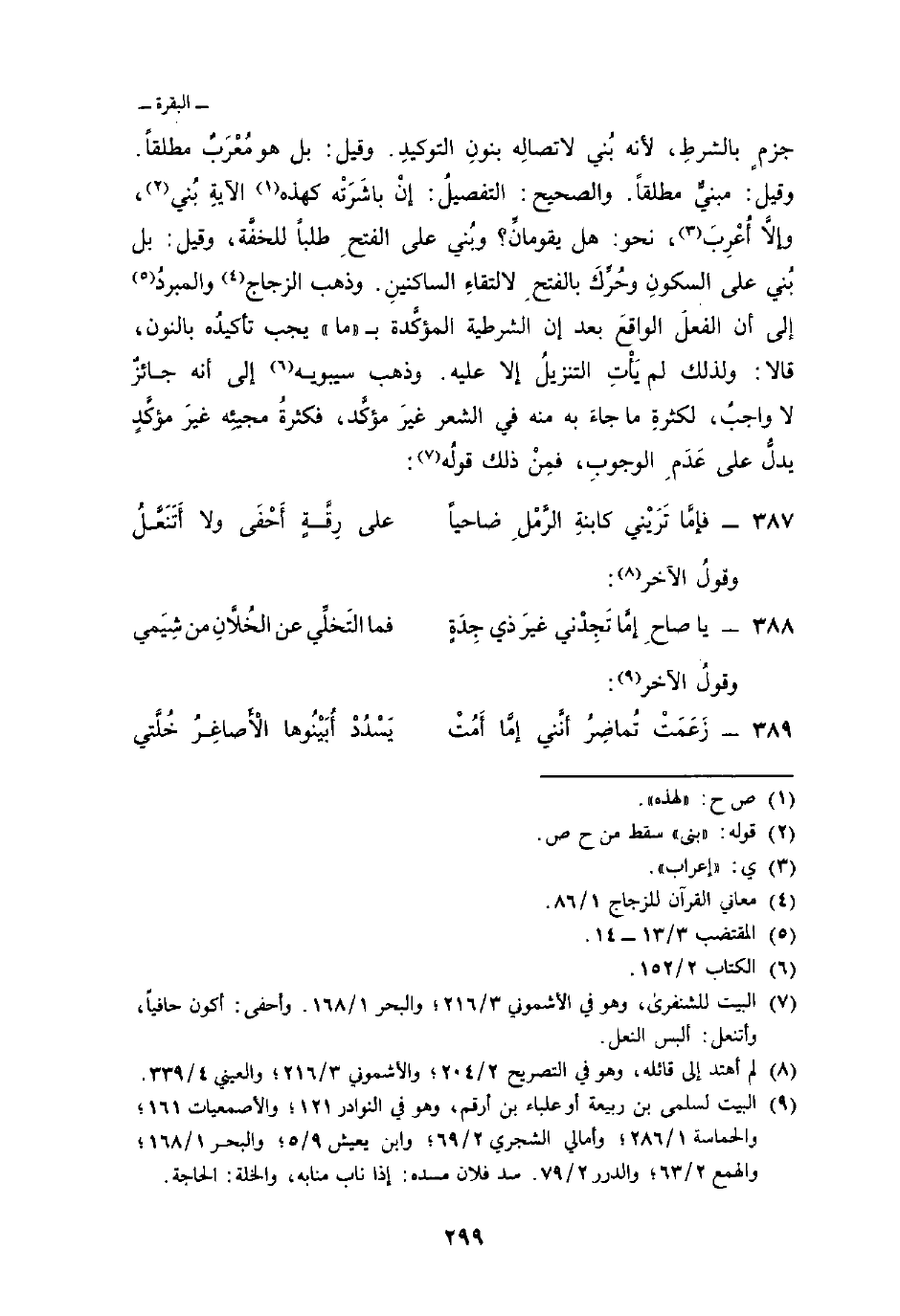 جزمٍ بالشرطِ، لأنه بُني لاتصالِه بنونِ التوكيدِ. وقيل: بل هو مُعْرَبٌ مطلقاً. وقيل: مبنيٌّ مطلقاً. والصحيح: التفصيلُ: إنْ باشَرَتْه كهذه الآيةِ بُني، وإلاَّ أُعْرِبَ، نحو: هل يقومانِّ؟ وبُني على الفتحِ طلباً للخفَّة، وقيل: بل بُني على السكونِ وحُرِّكَ بالفتحِ لالتقاءِ الساكنينِ. وذهب الزجاج والمبردُ إلى أن الفعلَ الواقعَ بعد إن الشرطية المؤكَّدة ب» ما «يجب تأكيدُه بالنون، قالا: ولذلك لم يَأْتِ التنزيلُ إلا عليه. وذهب سيبويه إلى أنه جائزٌ لا واجبٌ، لكثرةِ ما جاءَ به منه في الشعر غيرَ مؤكَّد، فكثرةُ مجيئِه غيرَ مؤكَّدٍ يدلُّ على عَدَمِ الوجوبِ، فمِنْ ذلك قولُه: