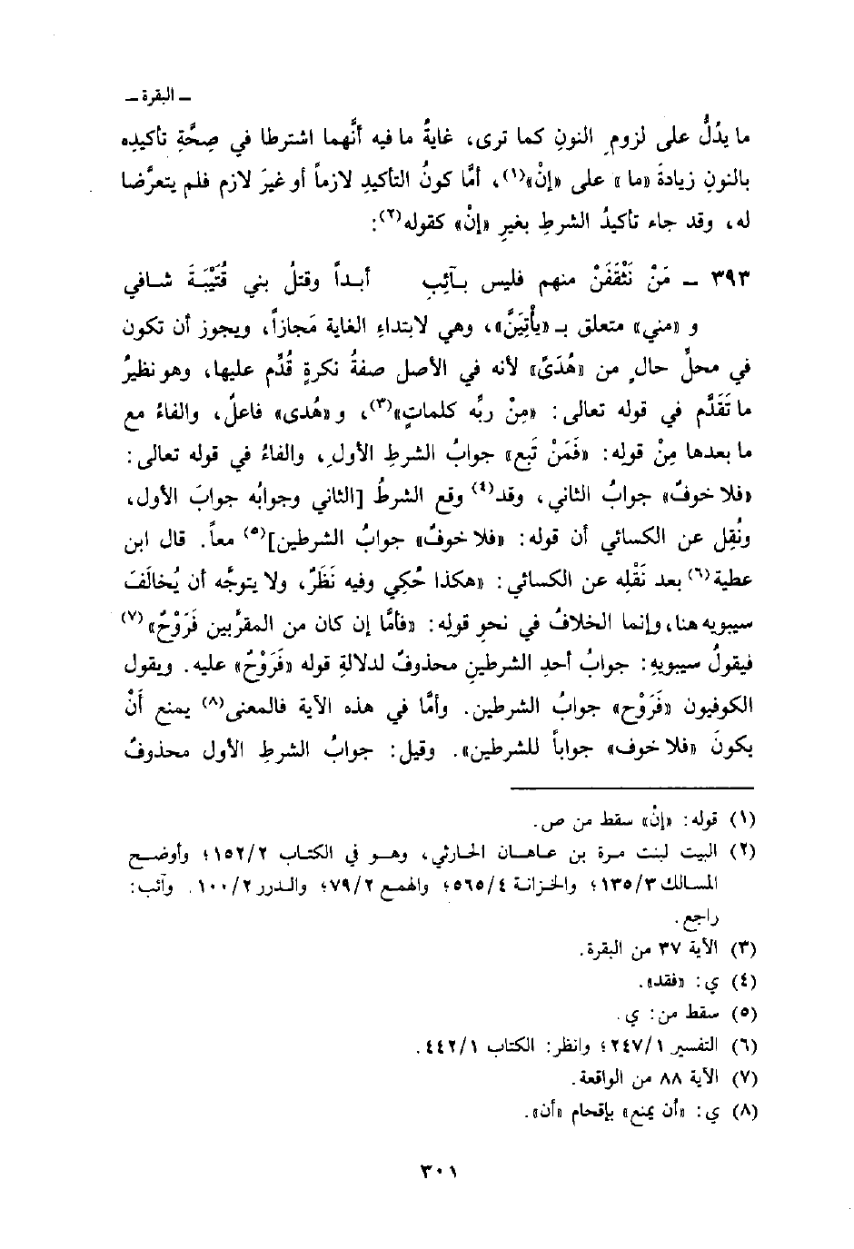 و» مني «متعلق ب» يَأْتِيَنَّ «، وهي لابتداءِ الغاية مَجازاً، ويجوز أن تكون في محلِّ حالٍ من» هُدَىً «لأنه في الأصل صفةُ نكرةٍ قُدِّم عليها، وهو نظيرُ ما تَقَدَّم في قوله تعالى: {مِن رَّبِّهِ كَلِمَاتٍ} [البقرة: 37] ، و» هُدى «فاعلٌ، والفاءُ مع ما بعدها مِنْ قولِه: {فَمَن تَبِعَ} جوابُ الشرطِ الأولِ، والفاءُ في قوله تعالى: {فَلاَ خَوْفٌ} جوابُ الثاني، وقد وقع الشرطُ [الثاني وجوابُه جوابَ الأول، ونُقِل عن الكسائي أن قوله: {فَلاَ خَوْفٌ} جوابُ الشرطين] معاً. قال ابن عطية بعد نَقْلِه عن الكسائي:» هكذا حُكِي وفيه نَظَرٌ، ولا يتوجَّه أن يُخالَفَ سيبويه هنا، وإنما الخلافُ في نحوِ قولِه: {فَأَمَّآ إِن كَانَ مِنَ المقربين فَرَوْحٌ} [الواقعة: 88-89] فيقولُ سيبويهِ: جوابُ أحدِ الشرطينِ محذوفٌ لدلالةِ قوله «فَرَوْحٌ» عليه. ويقول الكوفيون «فَرَوْح» جوابُ الشرطين. وأمَّا في هذه الآية فالمعنى يمنع أَنْ يكونَ «فلا خوف» جواباً للشرطين «. وقيل: جوابُ الشرطِ الأول محذوفٌ