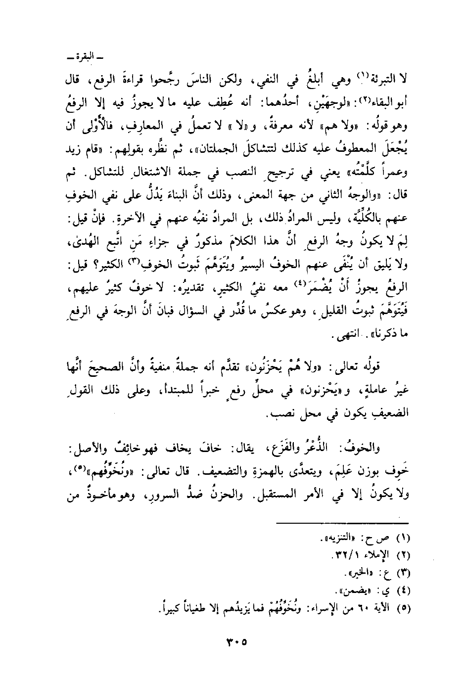 لا التبرئة وهي أبلغُ في النفي، ولكن الناسَ رجَّحوا قراءةَ الرفع، قال أبو البقاء: «لوجهَيْنِ، أحدُهما: أنه عُطِف عليه ما لا يجوزُ فيه إلا الرفعُ وهو قولُه:» ولا هم «لأنه معرفةٌ، و» لا «لا تعملُ في المعارِفِ، فالأَوْلى أن يُجْعَلَ المعطوفُ عليه كذلك لتتشاكلَ الجملتان» ، ثم نظَّره بقولِهم: «قام زيد وعمراً كلَّمْتُه» يعني في ترجيحِ النصب في جملة الاشتغالِ للتشاكل. ثم قال: «والوجهُ الثاني من جهة المعنى، وذلك أنَّ البناءَ يَدُلُّ على نفي الخوفِ عنهم بالكُلِّيَّة، وليس المراد ذلك، بل المرادُ نفيُه عنهم في الآخرةِ. فإنْ قيل: لِمَ لا يكونُ وجهُ الرفعِ أنَّ هذا الكلامَ مذكورٌ في جزاءِ مَنِ اتَّبع الهدى، ولا يَليق أن يُنْفَى عنهم الخوفُ اليسيرُ ويُتَوَهَّمَ ثَبوتُ الخوفِ الكثير؟ قيل: الرفعُ يجوزُ أَنْ يُضْمَرَ معه نفيُ الكثيرِ، تقديرُه: لا خوفٌ كثيرٌ عليهم، فيُتَوَهَّمَ ثبوتَ القليلِ، وهو عكسُ ما قُدِّر في السؤال فبانَ أنَّ الوجهَ في الرفعِ ما ذكرنا» . انتهى.