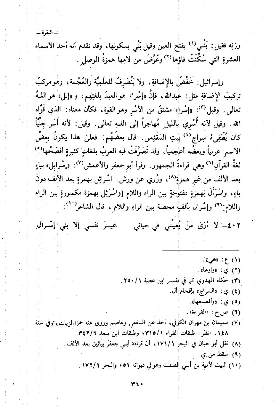 وإسرائيل: خَفْضٌ بالإِضافةِ، ولا يَنْصَرِفُ للعلَمِيَّة والعُجْمة، وهو مركبٌ تركيبَ الإِضافةِ مثل: عبد الله، فإنَّ «إسْرا» هو العبدُ بلغتِهم، و «إيل» هو اللهُ تعالى. وقيل: «إسْرا» مشتقٌ من الأسْرِ وهو القوة، فكأن معناه: الذي قَوَّاه الله. وقيل لأنه أُسْرِي بالليلِ مُهاجراً إلى اللهِ تعالى. وقيل: لأنه أَسَرَ جِنِّيَّاً كان يُطْفِئُ سِراج بيتِ المَقْدِس. قال بعضُهُم: فعلى هذا يكونُ الاسمِ عربياً وبعضُه أعجمياً، وقد تَصَرَّفَتْ فيه العربُ بلغاتٍ كثيرةٍ أفصَحُها لغةُ القرآنِ وهي قراءةُ الجمهور. وقرأ أبو جعفر والأعمش، «إسْرايِل» بياءٍ بعد الألف من غيرِ همزةٍ، ورُوِي عن ورش: إسْرائِل بهمزةٍ بعد الألف دونَ ياءٍ، واسْرَأَلَ بهمزةٍ مفتوحةٍ بين الراء واللام [واسْرَئِل بهمزة مكسورةٍ بين الراء واللام] وإسْرال بألفٍ محضة بين الراءِ واللامِ، قال الشاعر: