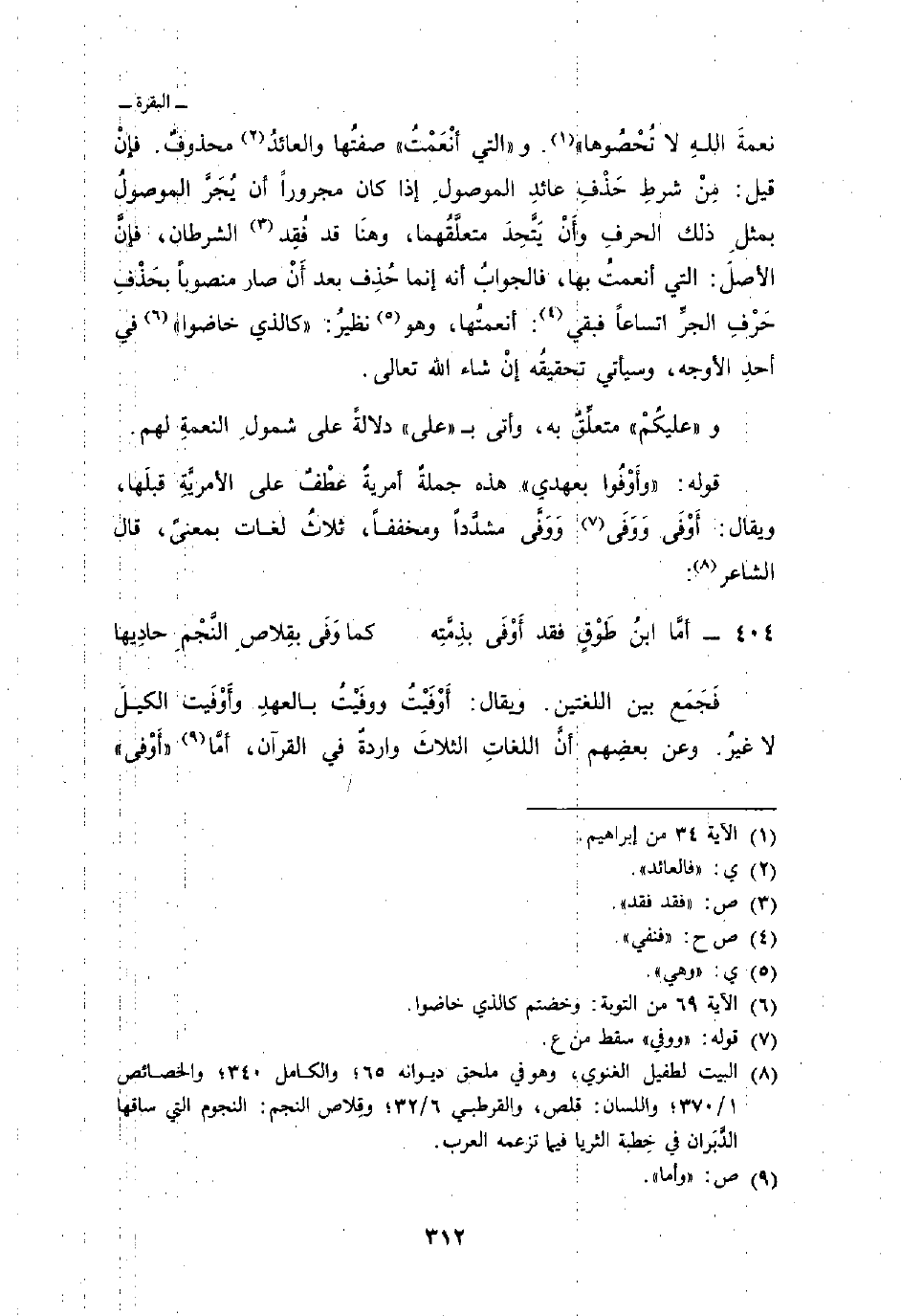 نِعْمَتَ الله لاَ تُحْصُوهَا} [إبراهيم: 34] . و {التي أَنْعَمْتُ} صفتُها والعائدُ محذوفٌ. فإنْ قيل: مِنْ شرطِ حَذْفِ عائدِ الموصولِ إذا كان مجروراً أن يُجَرَّ الموصولُ بمثلِ ذلك الحرفِ وأَنْ يَتَّحِدَ متعلَّقُهما، وهنَا قد فُقِد الشرطان، فإنَّ الأصلَ: التي أنعمتُ بها، فالجوابُ أنه إنما حُذِف بعد أَنْ صار منصوباً بحَذْفِ حَرْفِ الجرِّ اتساعاً فبقي: أنعمتُها، وهو نظيرُ: {كالذي خاضوا} [التوبة: 69] في أحدِ الأوجه، وسيأتي تحقيقُه إنْ شاء الله تعالى.