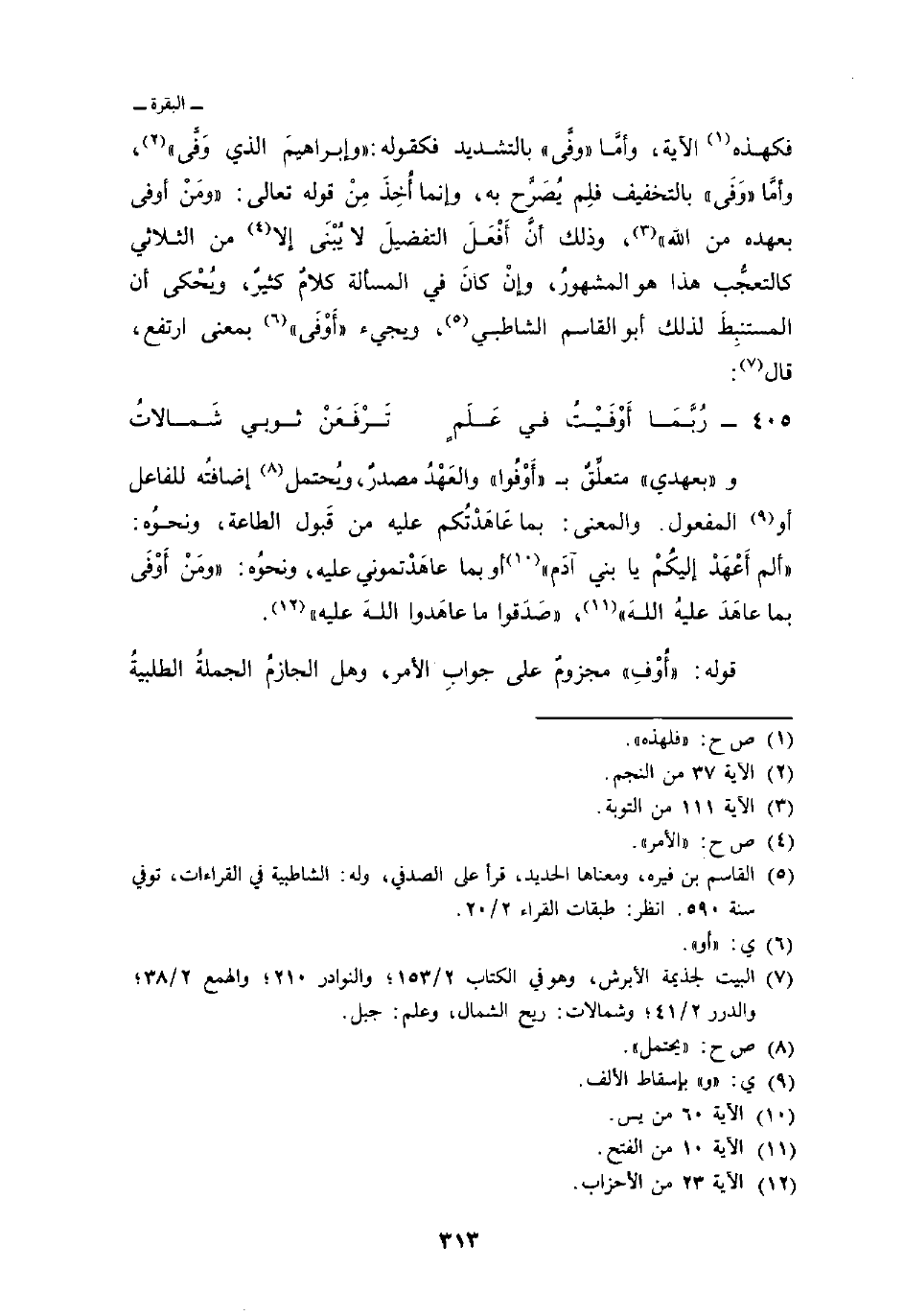 فكهذه الآية، وأمَّا «وفَّى» بالتشديد فكقوله: {وَإِبْرَاهِيمَ الذي وفى} [النجم: 37] ، وأمَّا «وَفَى» بالتخفيف فلِم يُصَرَّح به، وإنما أُخِذَ مِنْ قوله تعالى: {وَمَنْ أوفى بِعَهْدِهِ مِنَ الله} [التوبة: 111] ، وذلك أنَّ أَفْعَلَ التفضيلَ لا يُبْنَى إلا من الثلاثي كالتعجُّب هذا هو المشهورُ، وإنْ كانَ في المسألة كلامٌ كثيرٌ، ويُحْكى أن المستنبِطَ لذلك أبو القاسم الشاطبي، ويجيء «أَوْفَى» بمعنى ارتفع، قال:
