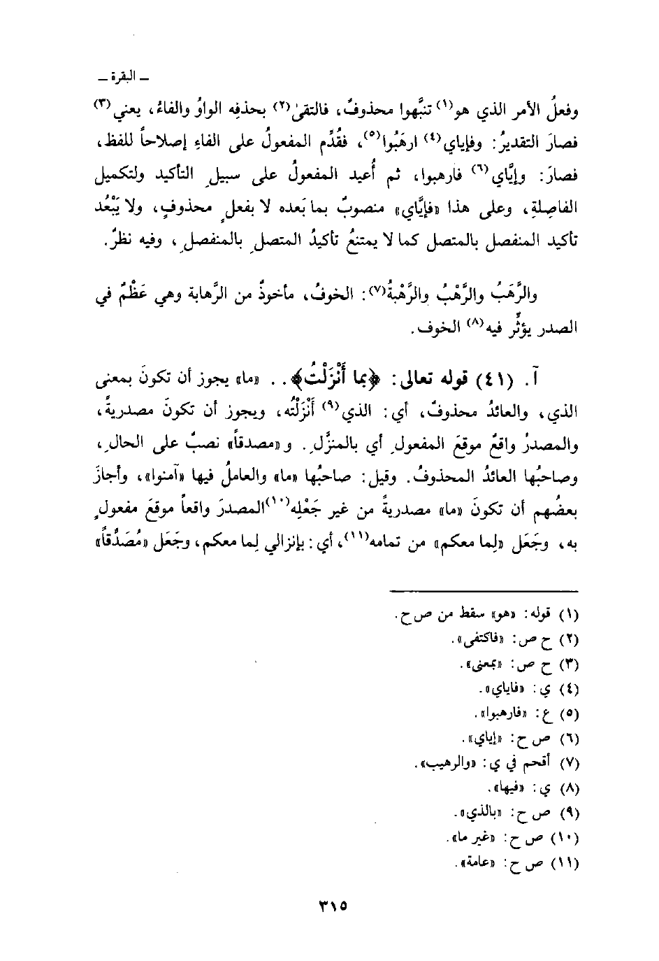 وفعلُ الأمر الذي هو تنبَّهوا محذوفٌ، فالتقى بحذفِه الواوُ والفاءُ، يعني فصارَ التقديرُ: وفإياي ارهَبُوا، فقُدِّم المفعولُ على الفاءِ إصلاحاً للفظ، فصارَ: وإيَّاي فارهبوا، ثم أُعيد المفعولُ على سبيل ِ التأكيد ولتكميل الفاصِلةِ، وعلى هذا» فإيَّاي «منصوبٌ بما بَعده لا بفعلٍ محذوفٍ، ولا يَبْعُد تأكيد المنفصل بالمتصل كما لا يمتنعُ تأكيدُ المتصلِ بالمنفصلِ، وفيه نظرٌ.