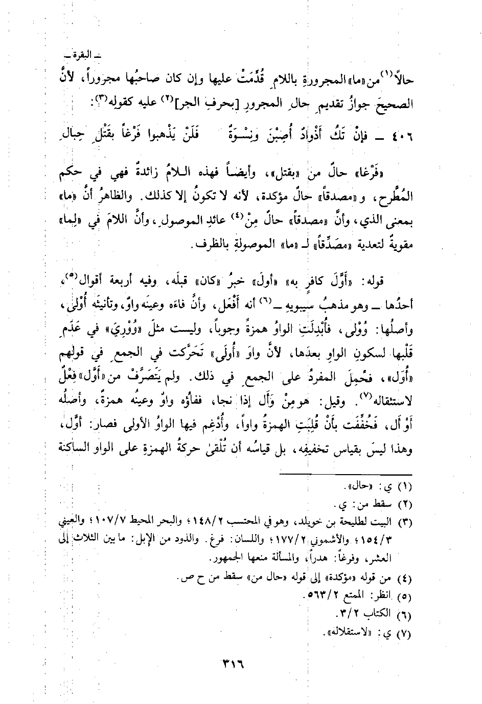 قوله: {أَوَّلَ كَافِرٍ بِهِ} «أولَ» خبرُ «كان» قبلَه، وفيه أربعة أقوال، أحدُها وهو مذهبُ سيبويهِ أنه أَفْعَل، وأنَّ فاءَه وعينَه واوٌ، وتأنيثَه أُوْلى، وأصلُها: وُوْلى، فأُبْدِلَتِ الواوُ همزةً وجوباً، وليست مثلَ «وُوْرِيَ» في عَدَمِ قَلْبها لسكونِ الواوِ بعدَها، لأنَّ واوَ «أُولَى» تَحَرَّكت في الجمعِ في قولهم «أُوَل» ، فحُمِلَ المفردُ على الجمعِ في ذلك. ولم يَتَصَرَّفْ من «أوَّل» فِعْلٌ لاستثقاله. وقيل: هو مِنْ وَأَل إذا نجا، ففاؤُه واوٌ وعينُه همزةٌ، وأصلُه أَوْ أَل، فَخُفِّفَت بأَنْ قُلِبَتِ الهمزةُ واواً، وأُدْغِم فيها الواوُ فصار: أوَّل، وهذا ليسَ بقياس تخفيفِه، بل قياسُه أن تلقى حركةُ الهمزةِ على الواو الساكنة