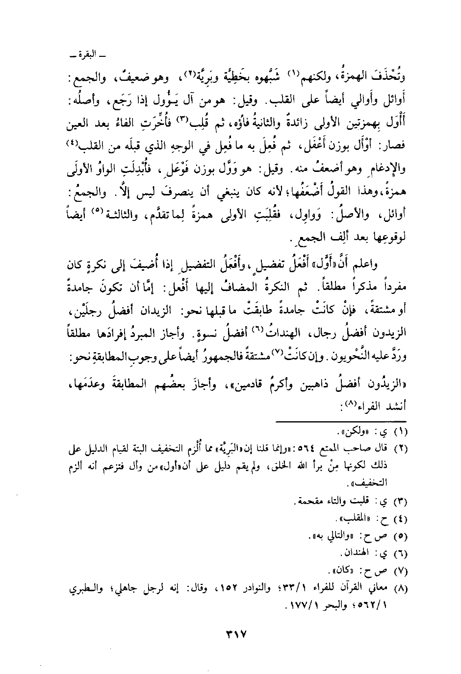 ثم النكرةُ المضافُ إليها أَفْعل: إمَّا أن تكونَ جامدةً أو مشتقةً، فإنْ كانَتْ جامدةً طابقَتْ ما قبلها نحو: الزيدان أفضلُ رجلَيْن، الزيدون أفضلُ رجال، الهنداتُ أفضلُ نسوةٍ. وأجاز المبردُ إفرادَها مطلقاً ورَدَّ عليه النَّحْويون. وإن كانَتْ مشتقةً فالجمهورُ أيضاً على وجوبِ المطابقةِ نحو: «الزيدُون أفضلُ ذاهبين وأكرمُ قادمين» ، وأجازَ بعضُهم المطابقةَ وعدَمَها، أنشد الفراء: